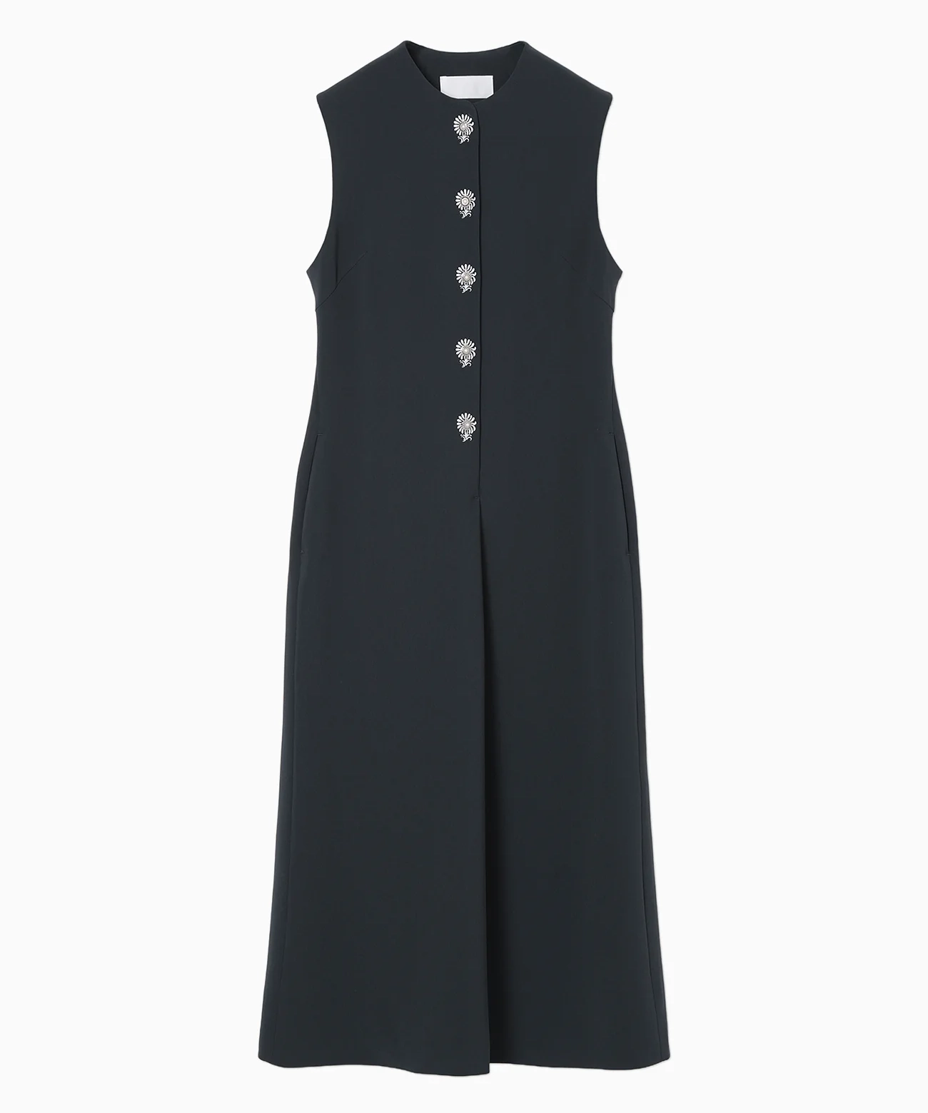 前立てに咲くように配された刺繍と小粒のパールボタンが、上半身を上品に印象づける一着。とろみと程よい厚みを備えた生地が身体に沿って落ち、ウエストから裾へすっと伸びるIラインが美しい。披露宴やセレモニー、レストランでの会食など幅広く活躍します。