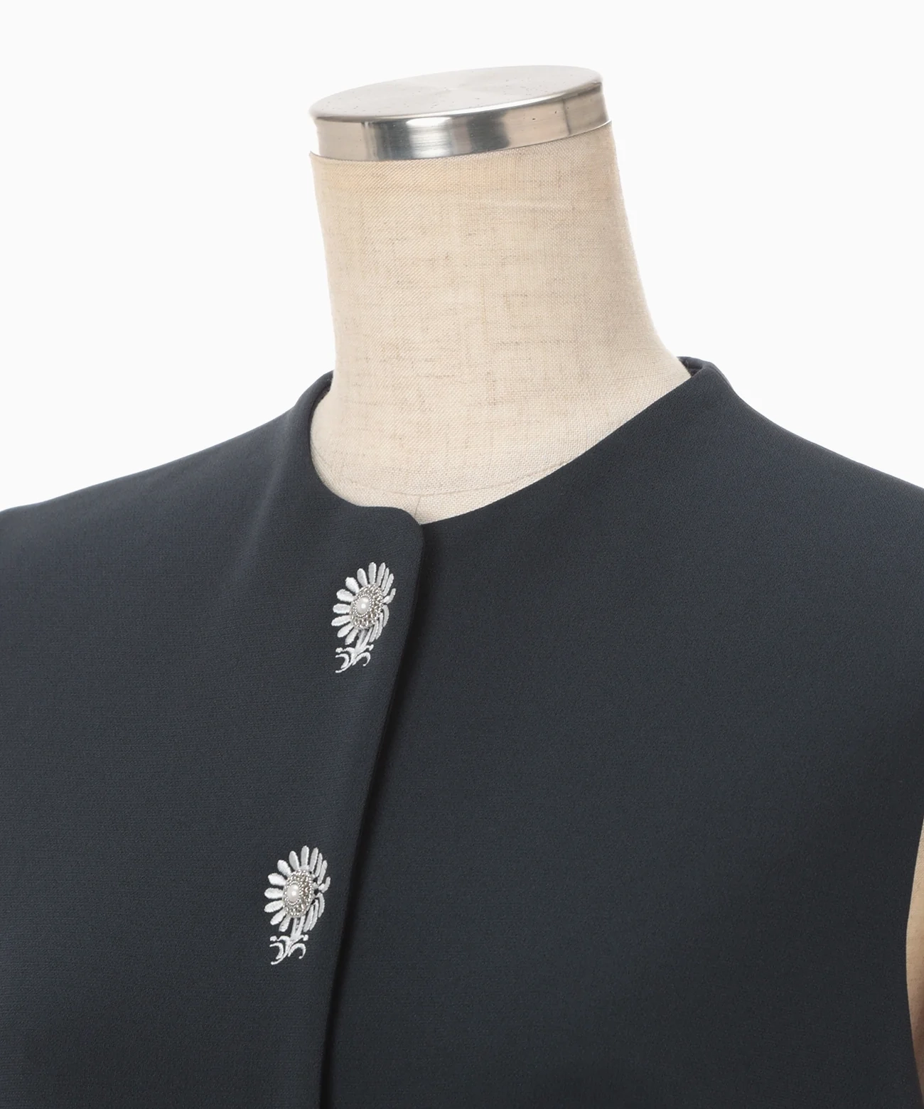 トリアセテート×ポリエステルの特殊仮撚加工糸による平二重組織生地を採用。シルキーな手触りとふくらみ感、シワになりにくい扱いやすさが特徴です。フロントはボタンホールにまで刺繍をあしらい、パールボタンの周囲に小花のような装飾を配置。ウエストからストレートに落ちるミニマルなスカートと落ち着いたカラーパレットで、季節やシーンを問わず着用いただけます。