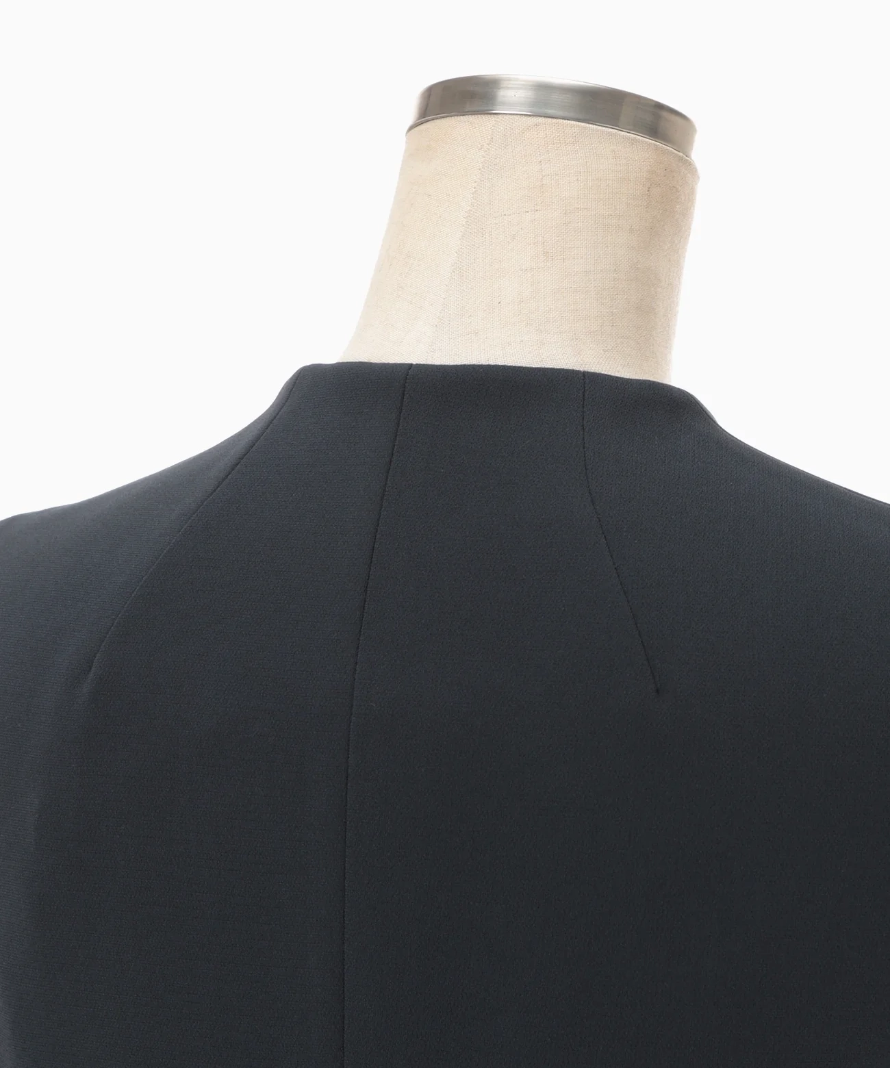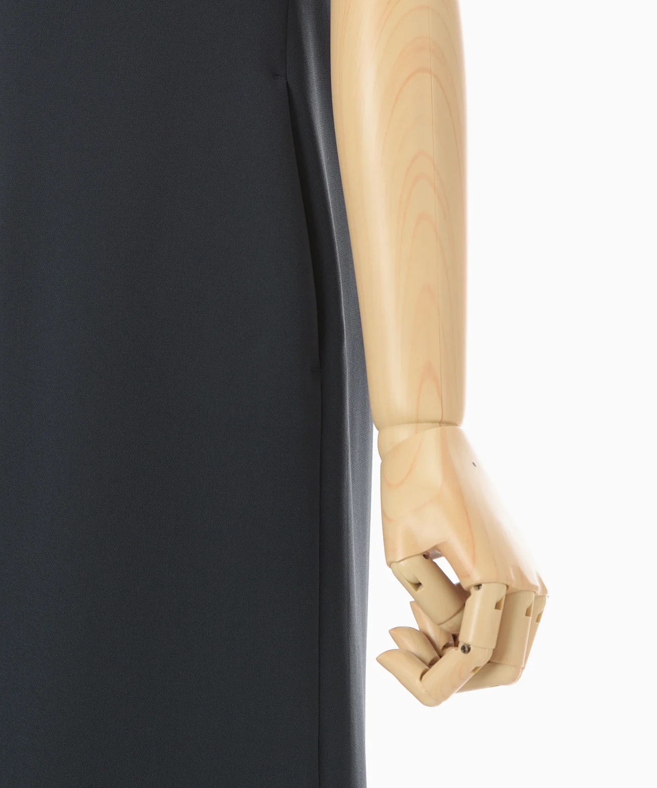 前立てに咲くように配された刺繍と小粒のパールボタンが、上半身を上品に印象づける一着。とろみと程よい厚みを備えた生地が身体に沿って落ち、ウエストから裾へすっと伸びるIラインが美しい。披露宴やセレモニー、レストランでの会食など幅広く活躍します。