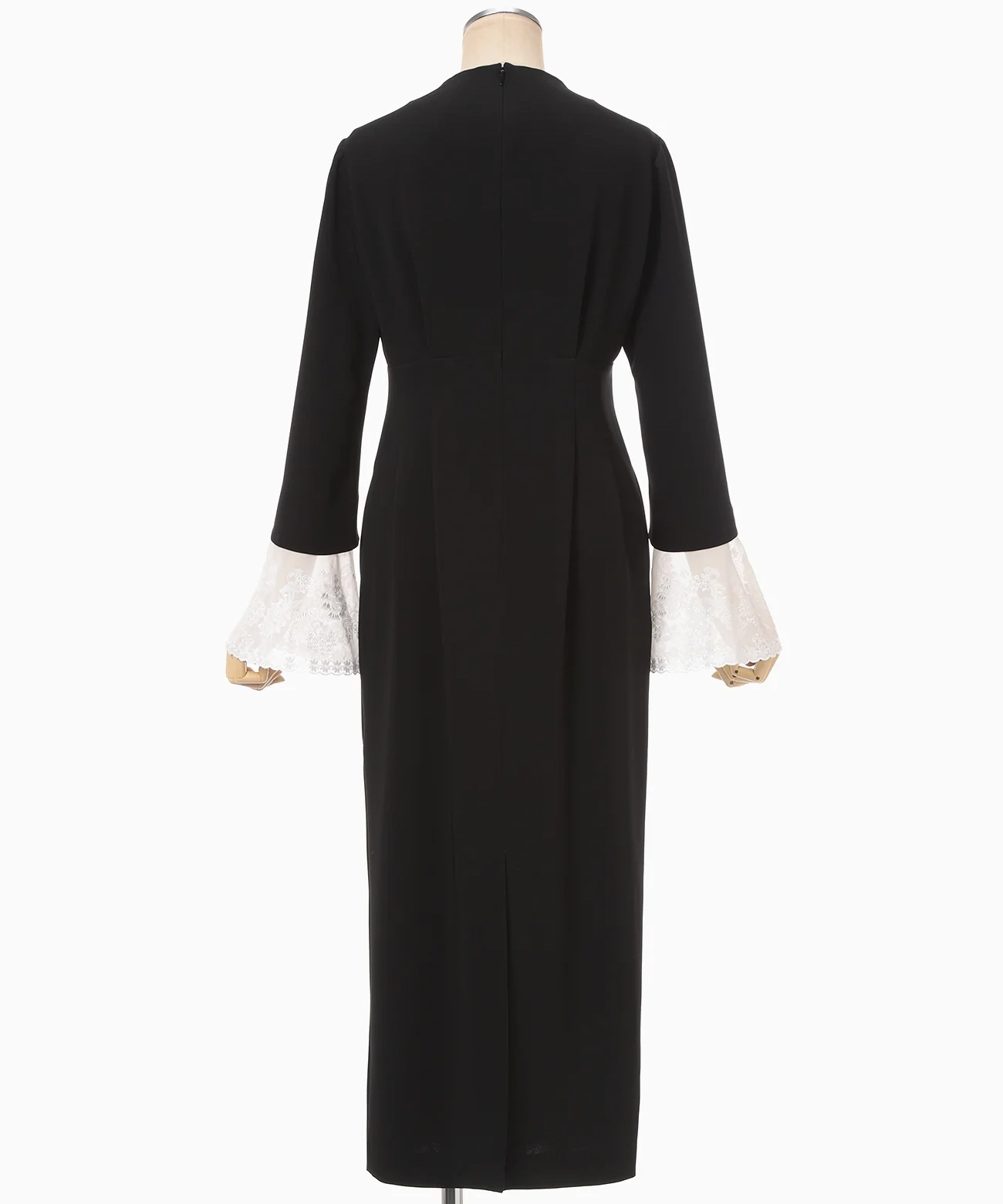 取り外し可能な刺繍カフスが手元の所作を美しく見せる、凛としたIラインドレス。高め位置でウエストをマークし、裾のスリットがほどよい抜け感をプラス。とろみがありつつシワになりにくい生地で、長時間のパーティーや移動のある日も快適に過ごせます。披露宴やセレモニー、ホテルディナーなどドレスアップ全般におすすめ。