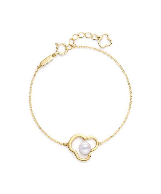 18Kイエローゴールド×あこや真珠の「チャンツ」ブレスレット。全長約17cm(アジャスター約2cmを含む)、トップは約縦13.5mm×横15.5mm、パールは約6.0mm。デイリーからオケージョンまで幅広く活躍するサイズ感です。