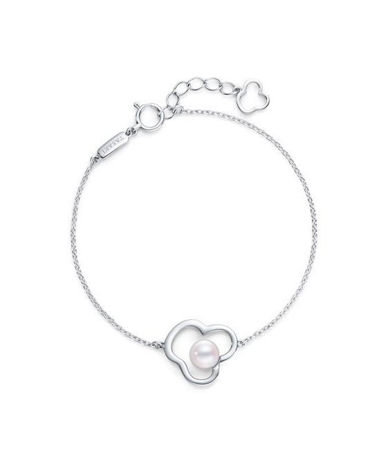 18Kホワイトゴールド×あこや真珠の「チャンツ」ブレスレット。全長約17cm(アジャスター約2cmを含む)で使い勝手が良く、トップは約縦13.5mm×横15.5mm、パールは約6.0mm。さりげない存在感で手元を上品に彩ります。