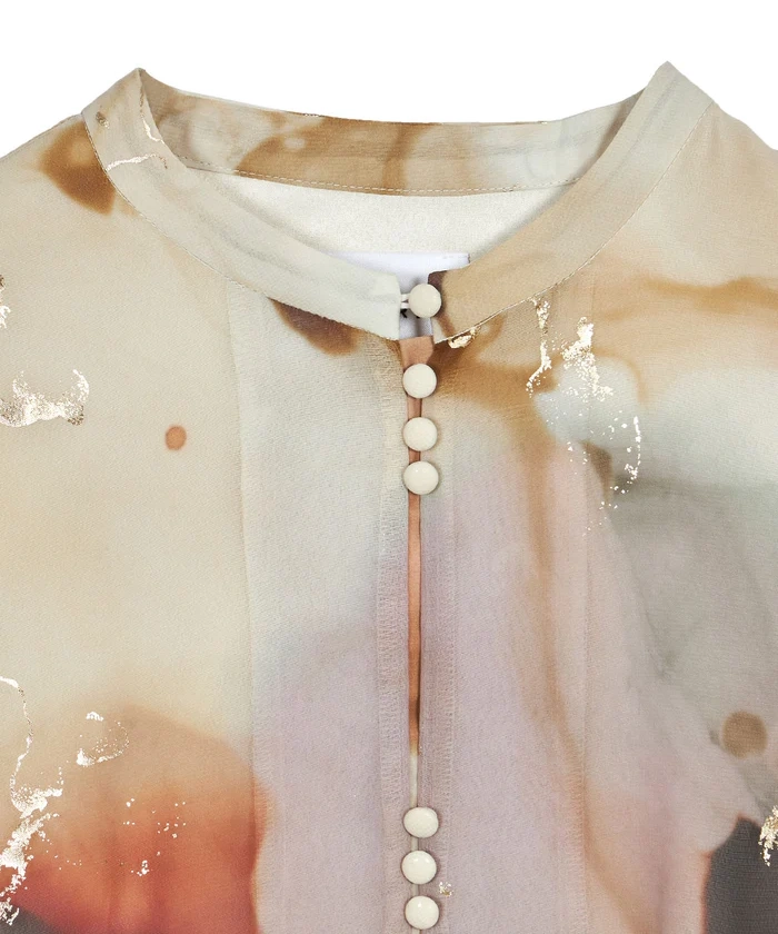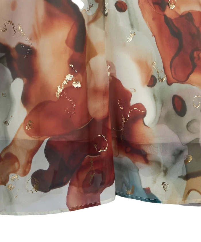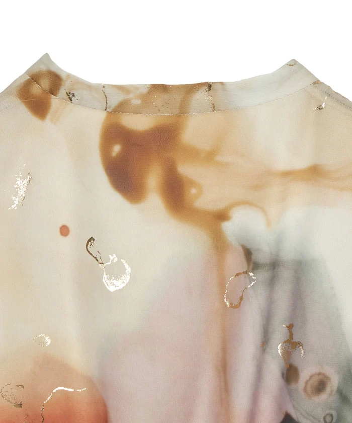 Ameriの人気ドレスが復刻。アルコールインクアート柄のワンピースでデザイン性が高く、金の箔プリントが華やかな印象のドレスです。ウエストのラインを変更することも可能なため、骨格タイプに関わらずご着用いただけます。商品特性上、目立たない糸つれがある場合がございます。予めご了承ください。