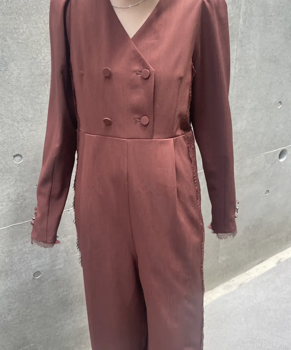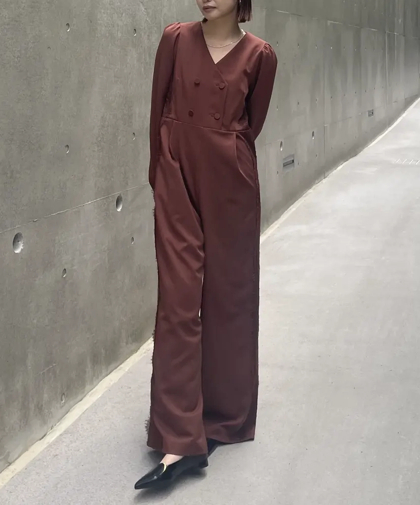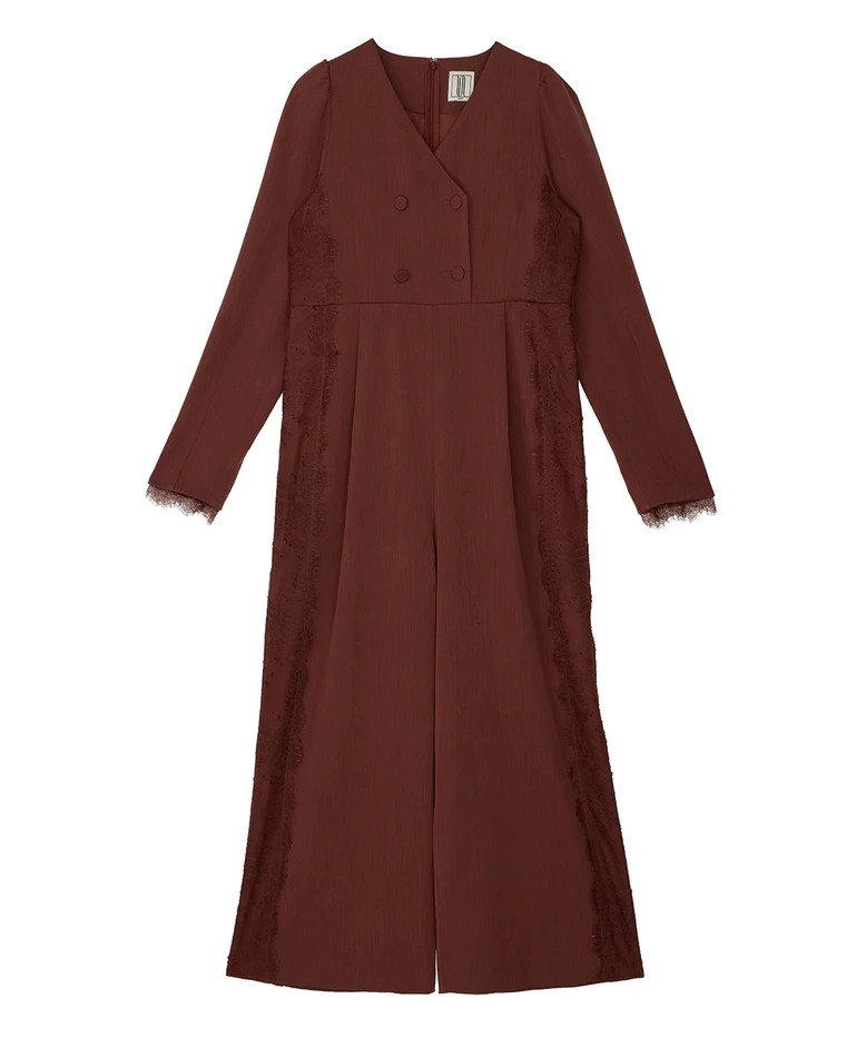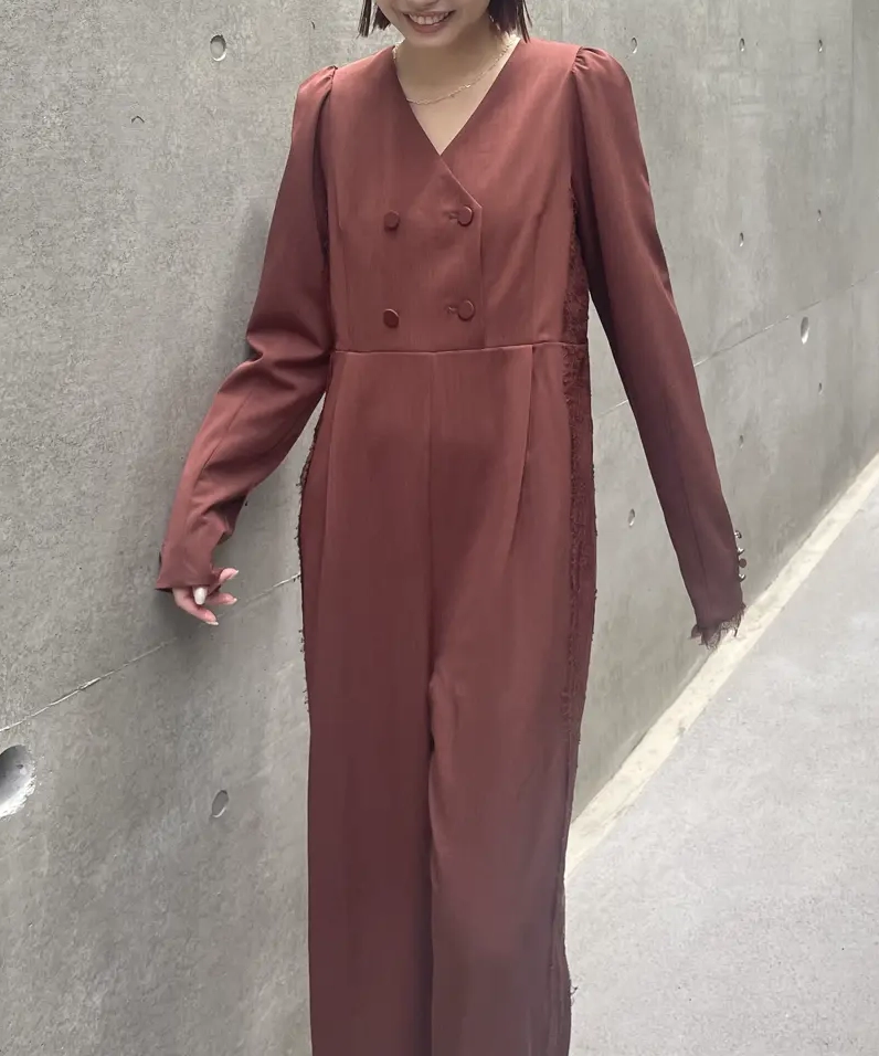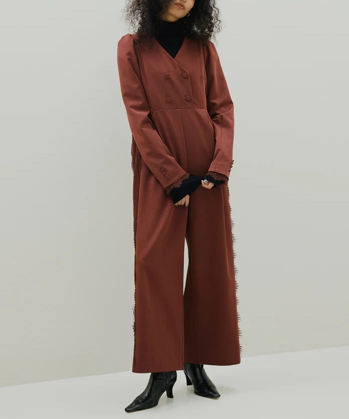 ブランドらしい上品な遊び心を取り入れたロマンティックなロンパースが登場しました。サイドにあしらった繊細なレースが、張りのあるスーツ地のワイドシルエットにほんのりと甘さをプラス。肩から腕にかけての立体感のあるフレアスリーブが女性らしさを際立たせ、デイリー使いから結婚式・パーティーなどの特別なシーンまで幅広く活躍します。後ろファスナー仕様で着脱もしやすく、1枚で印象を完成させる“洒落見え”アイテムです。