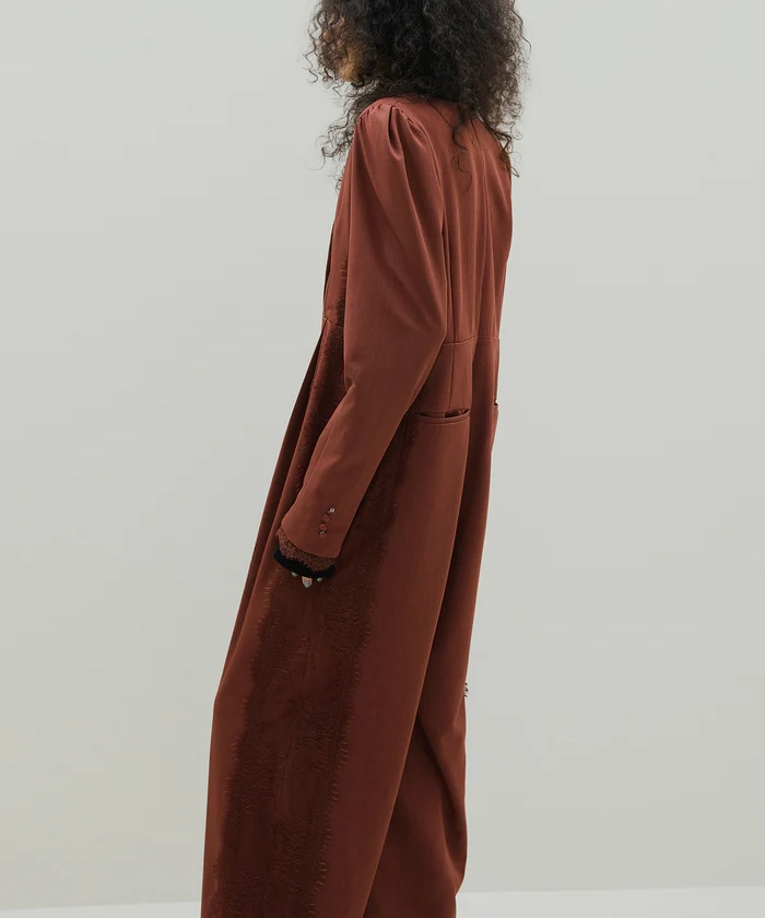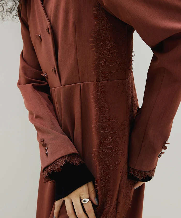 スーツ地をベースに、サイドや袖に太幅のレースを叩き付けた特別仕様。ゆったりとしたワイドシルエットでリラクシーな着心地を実現しながらも、レースの繊細なアクセントが抜け感と気品を両立。表情豊かなデザインに仕上げられており、裏地付き・透け感なし・伸縮性なしという仕様により、安心してきちんと感を保った装いが可能です。
