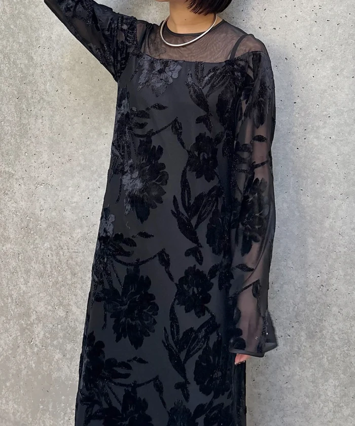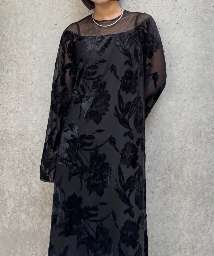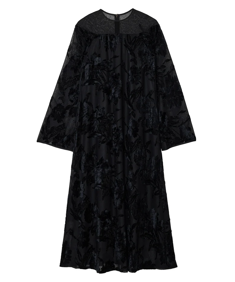 「SHEER JACQUARD A LINE DRESS」は、透け感のあるオパール素材を使用したAラインシルエットのドレスです。柄部分はベロアタッチになっており、季節感のある質感と立体的な表情を演出。肩のシアー切り替えが抜け感をつくりながらも、全体を上品にまとめています。光沢感とストレッチ性のある生地は動きやすさも◎。幅広いオケージョンシーンで活躍が期待できる1着です。