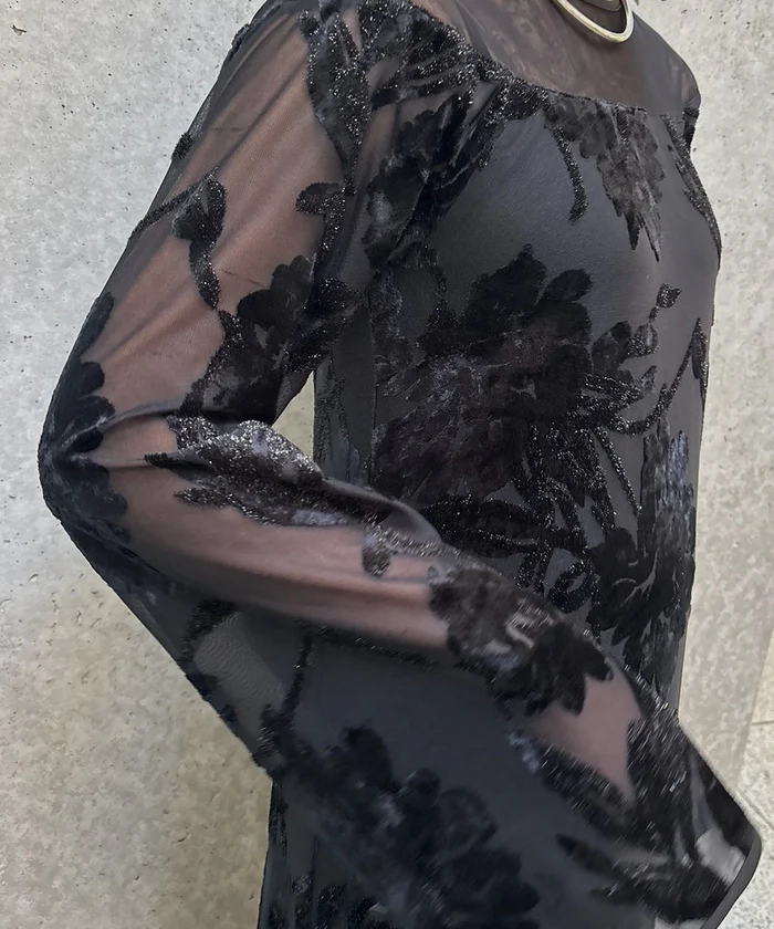 シアー素材とベロア調のジャカードが織りなす、フェミニンで洗練されたドレス。肩部分に透明感のある切り替えを施し、まるでオフショルダーのようなルックに見せるディテールが魅力です。薄手で軽やかな生地感ながら、光沢と上品さを併せ持ち、フォーマルなシーンでもしっかり存在感を放ちます。結婚式やパーティーはもちろん、成人式やセレモニーなどの特別な日にもぴったりの一着です。