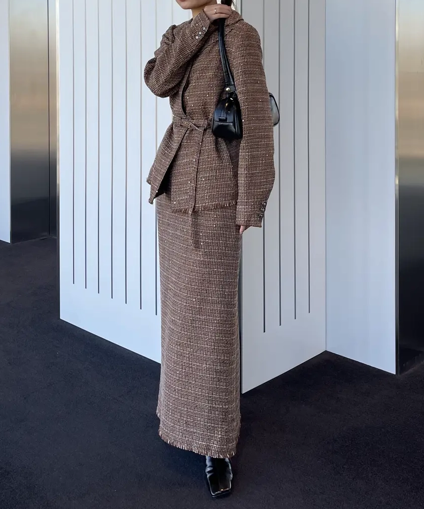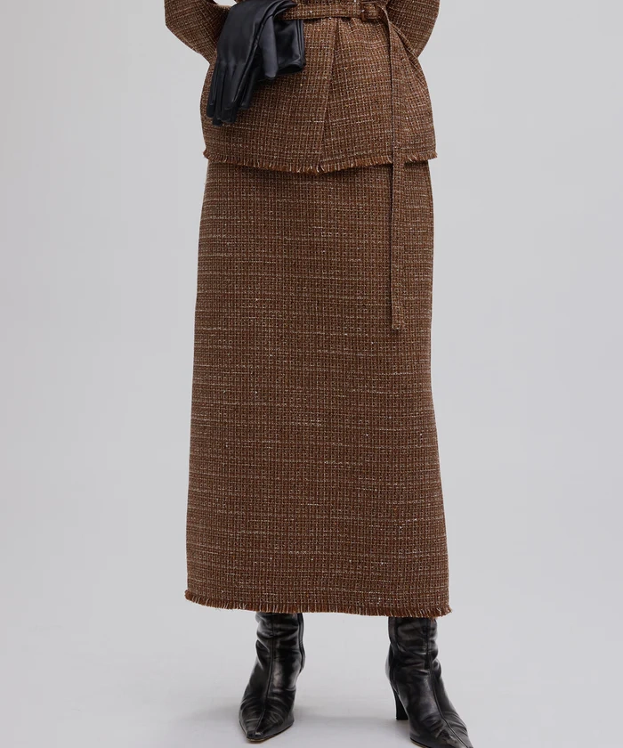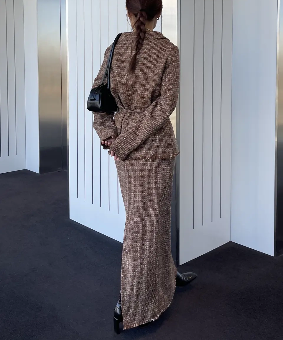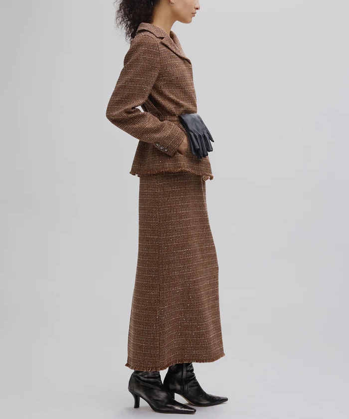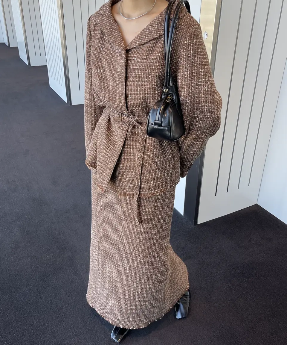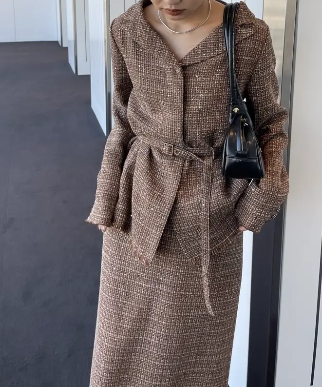 「GLITTER TWEED SET UP」は、ラメツイード素材を用いたトップスとスカートのセットアップです。オリジナルツイードにはラメやスパンコールが織り込まれ、上品な光沢感と華やかさが特徴。トップスは開いたデコルテラインと立体的な袖がデザインポイントで、細ベルト付きでアレンジも自在。スカートはシンプルなIラインシルエットにメロー&フリンジ仕様のディテールをプラスし、こなれ感のあるルックに仕上げています。セットでオケージョンシーンに、単体でデイリーまで幅広く対応します。