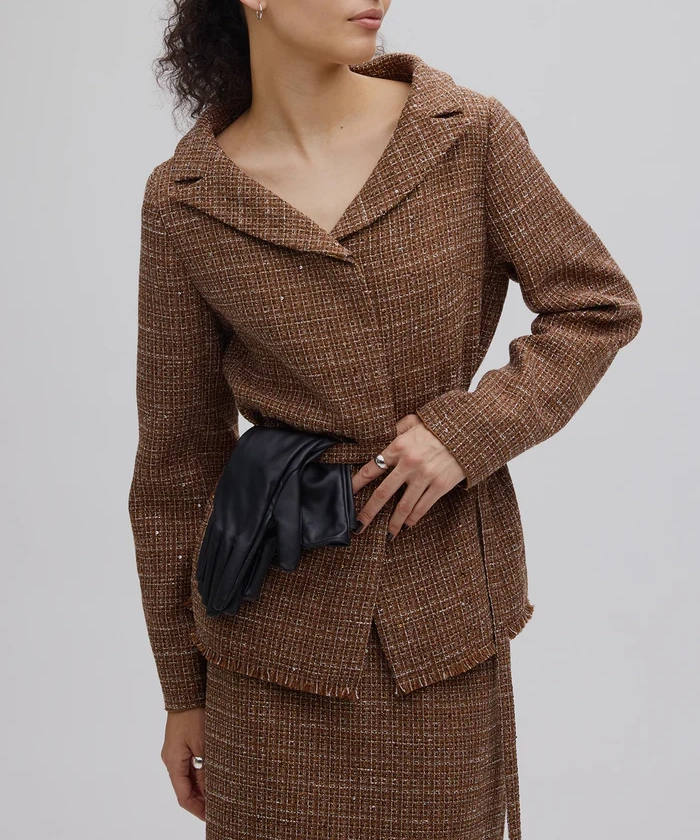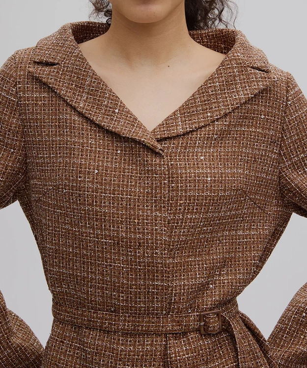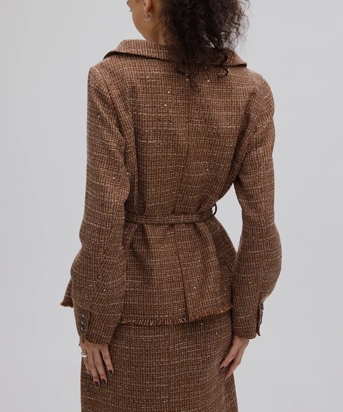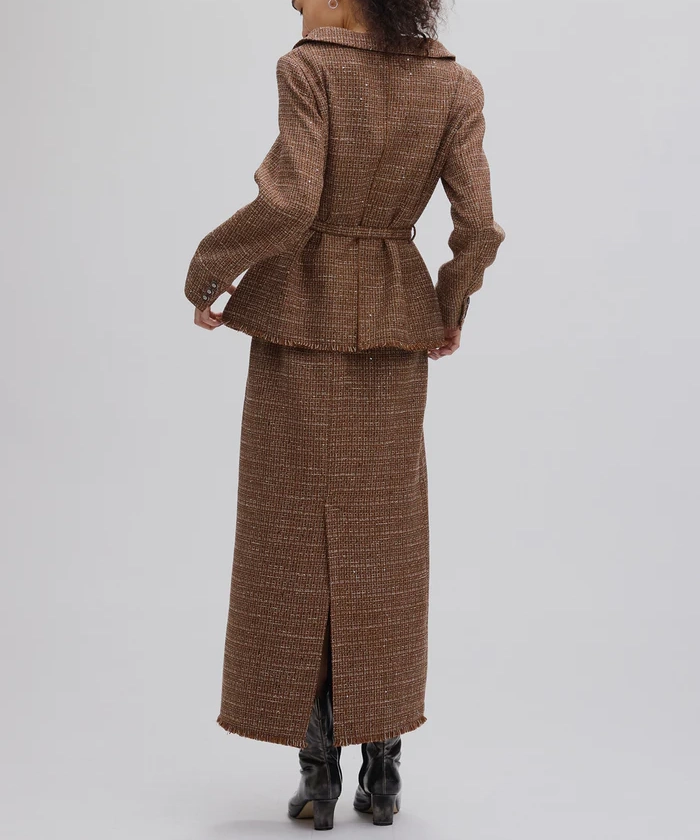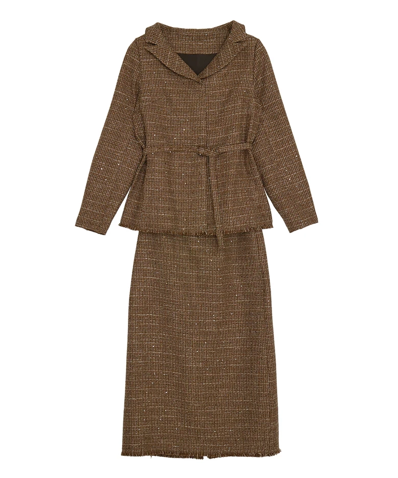 ラメとスパンコールが織り込まれたオリジナルツイード素材がキラリと輝く、華やかさと上品さを兼ね備えたセットアップ。デコルテが美しく見えるトップスは、構築的な袖と飾り釦が洗練されたアクセントに。付属の細ベルトでウエストマークすれば、スタイルアップ効果も期待できます。スカートはすっきりとしたIラインで、大人っぽいシルエットを演出。セットでも単品使いでも活躍する万能アイテムです。