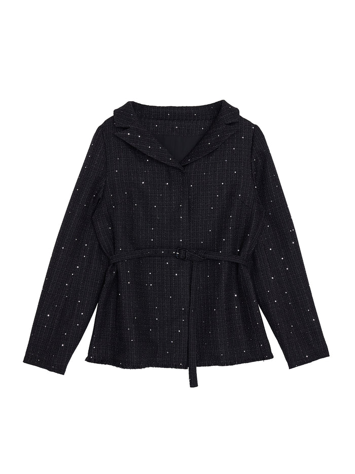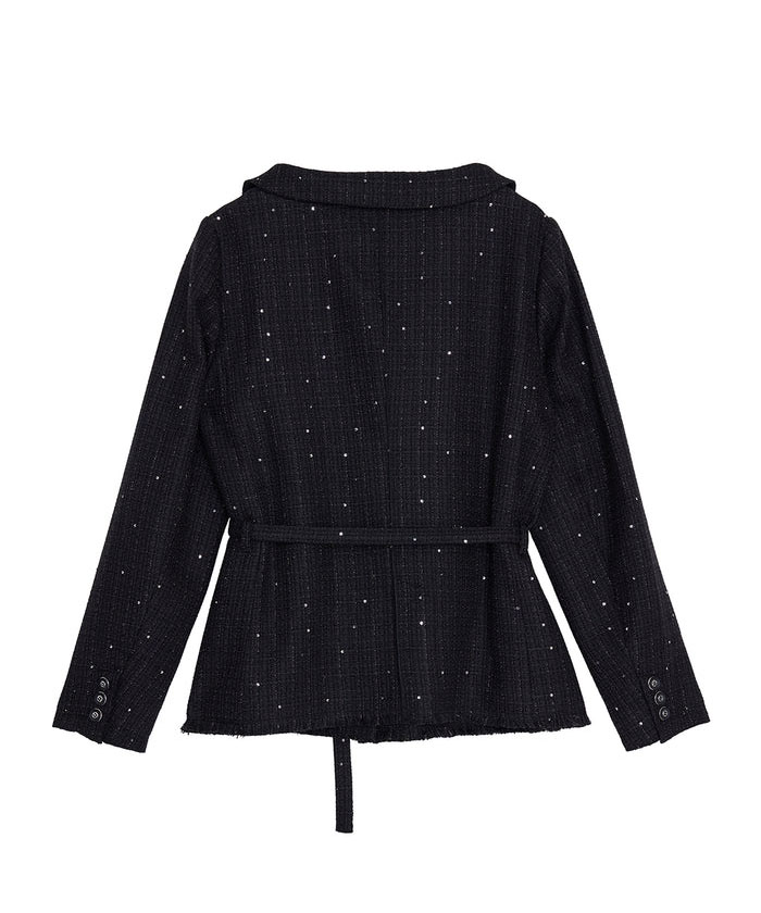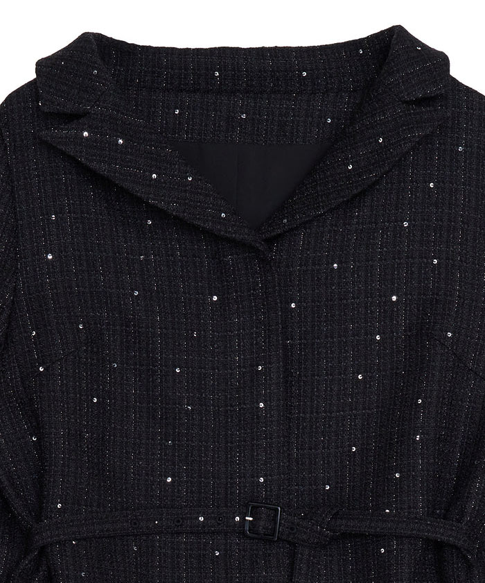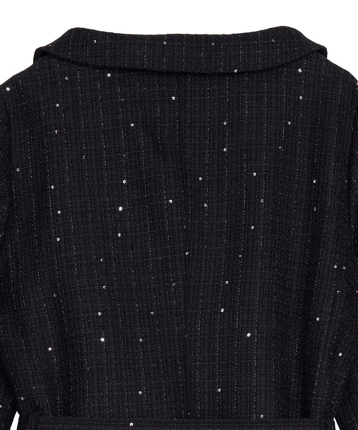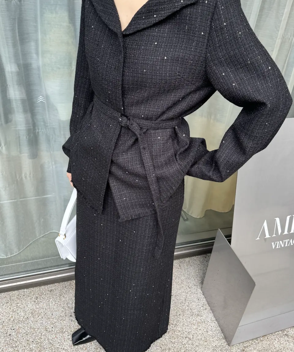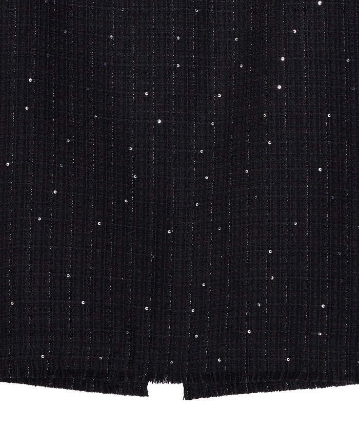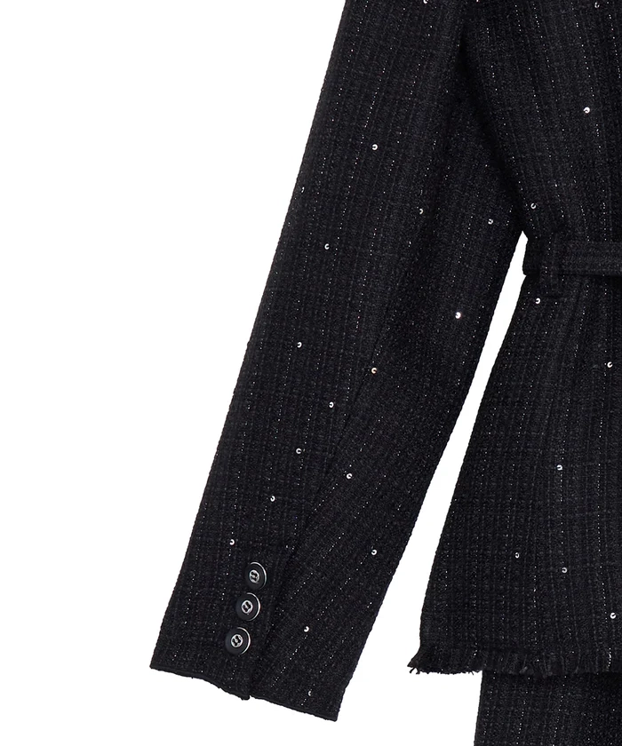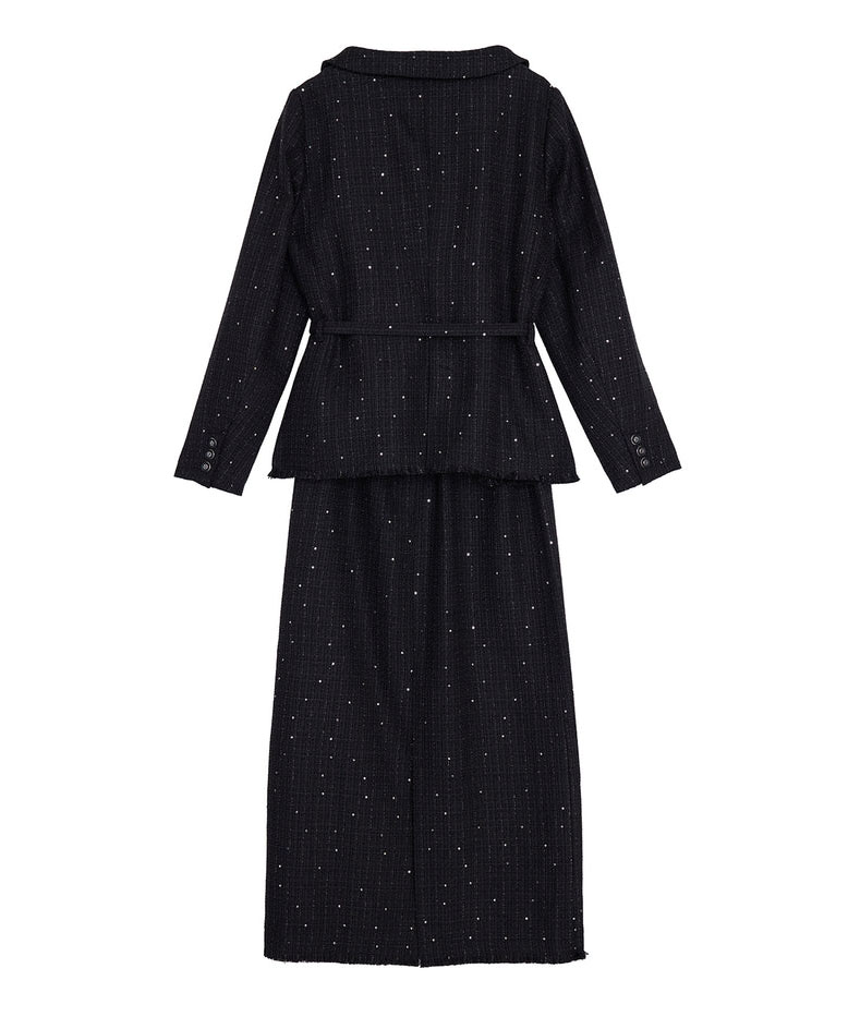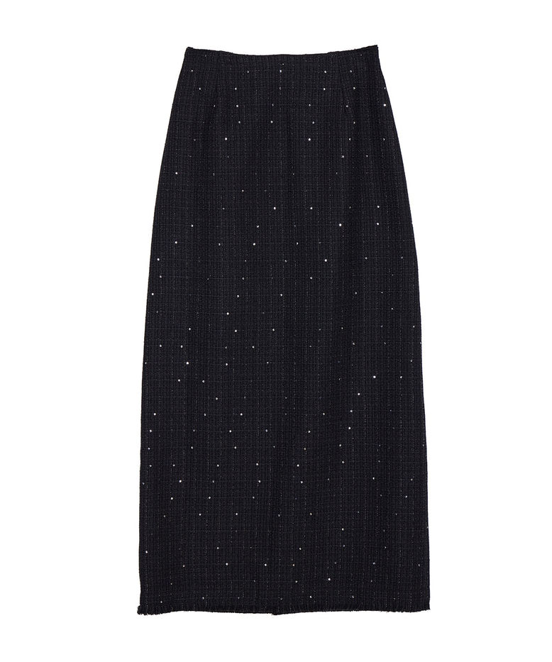 ラメとスパンコールが織り込まれたオリジナルツイード素材がキラリと輝く、華やかさと上品さを兼ね備えたセットアップ。デコルテが美しく見えるトップスは、構築的な袖と飾り釦が洗練されたアクセントに。付属の細ベルトでウエストマークすれば、スタイルアップ効果も期待できます。スカートはすっきりとしたIラインで、大人っぽいシルエットを演出。セットでも単品使いでも活躍する万能アイテムです。