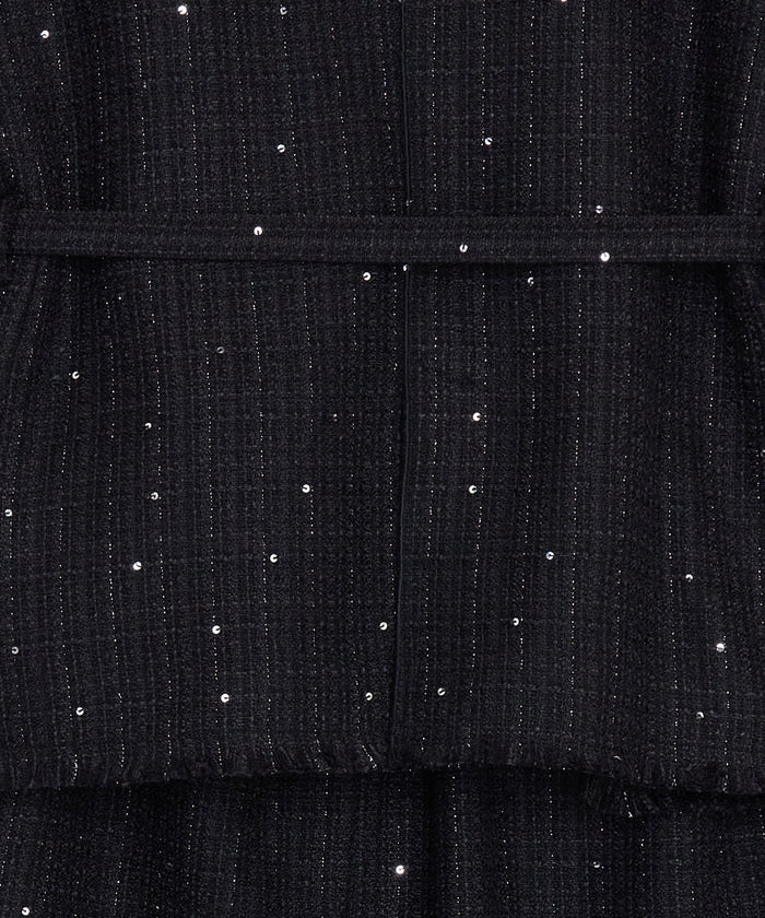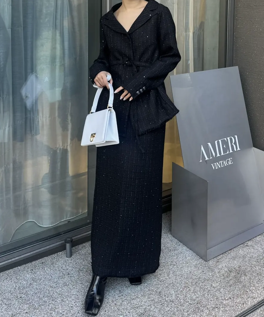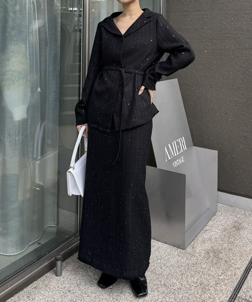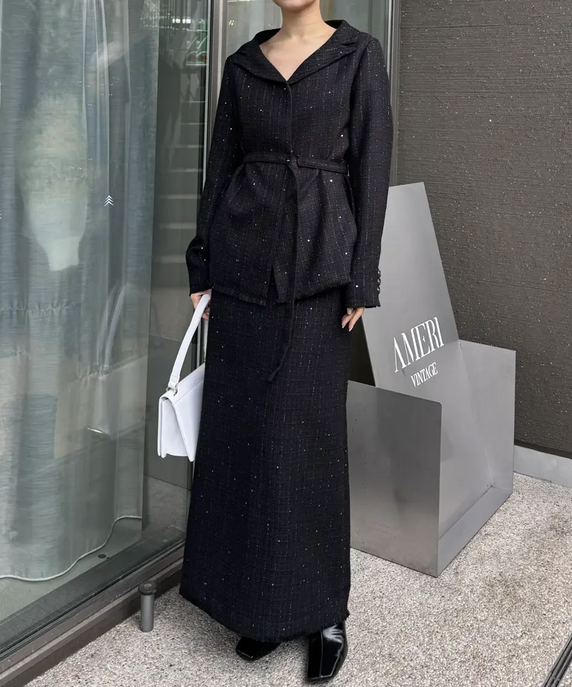 「GLITTER TWEED SET UP」は、ラメツイード素材を用いたトップスとスカートのセットアップです。オリジナルツイードにはラメやスパンコールが織り込まれ、上品な光沢感と華やかさが特徴。トップスは開いたデコルテラインと立体的な袖がデザインポイントで、細ベルト付きでアレンジも自在。スカートはシンプルなIラインシルエットにメロー&フリンジ仕様のディテールをプラスし、こなれ感のあるルックに仕上げています。セットでオケージョンシーンに、単体でデイリーまで幅広く対応します。