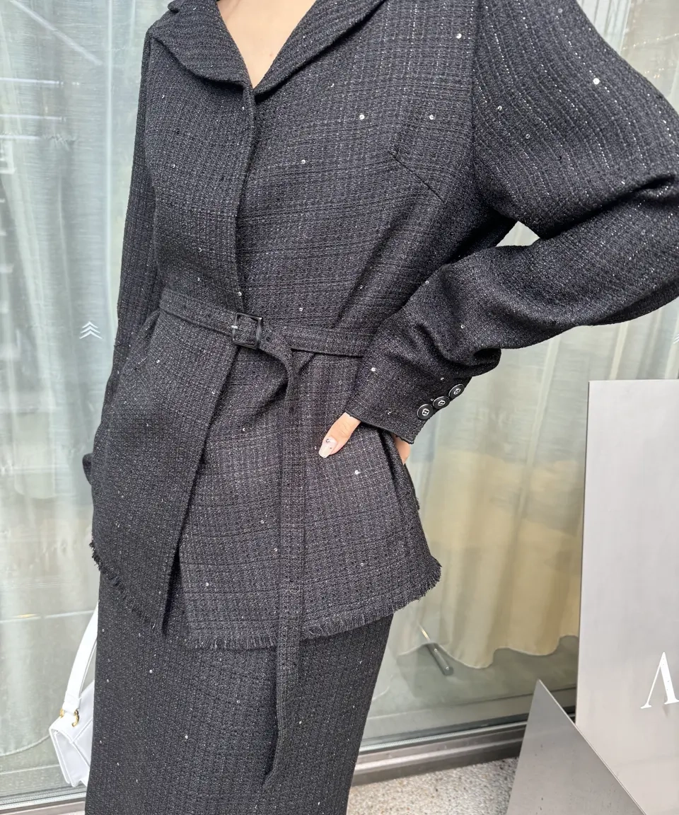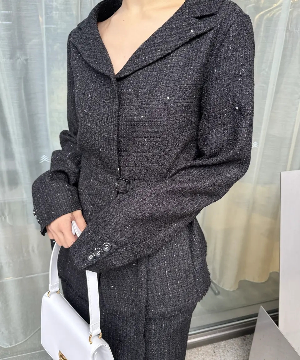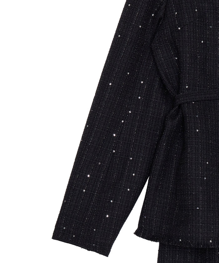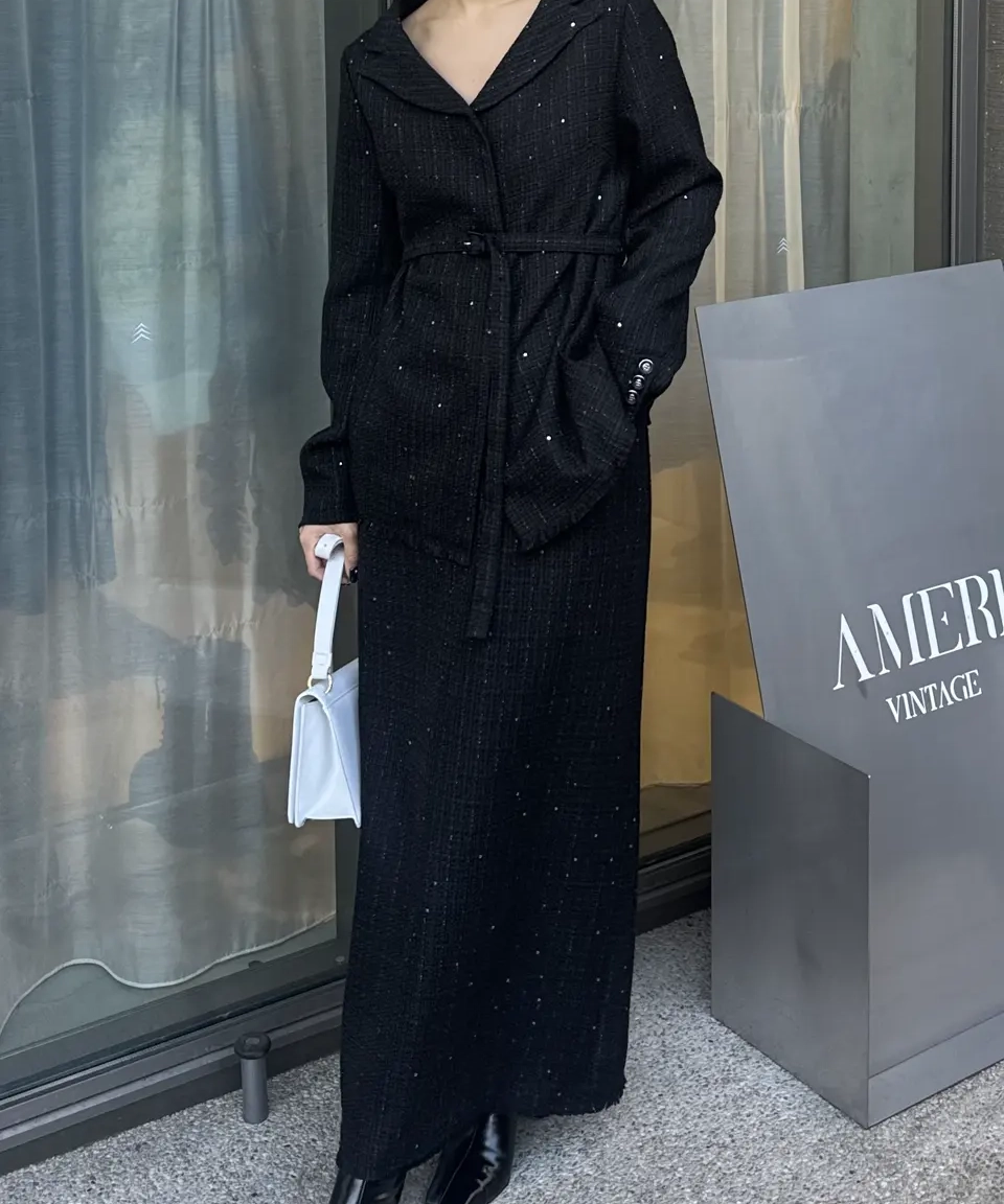 「GLITTER TWEED SET UP」は、ラメツイード素材を用いたトップスとスカートのセットアップです。オリジナルツイードにはラメやスパンコールが織り込まれ、上品な光沢感と華やかさが特徴。トップスは開いたデコルテラインと立体的な袖がデザインポイントで、細ベルト付きでアレンジも自在。スカートはシンプルなIラインシルエットにメロー&フリンジ仕様のディテールをプラスし、こなれ感のあるルックに仕上げています。セットでオケージョンシーンに、単体でデイリーまで幅広く対応します。