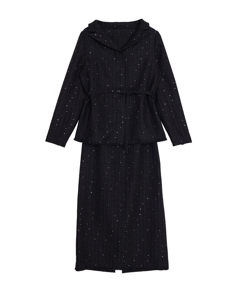 ラメとスパンコールが織り込まれたオリジナルツイード素材がキラリと輝く、華やかさと上品さを兼ね備えたセットアップ。デコルテが美しく見えるトップスは、構築的な袖と飾り釦が洗練されたアクセントに。付属の細ベルトでウエストマークすれば、スタイルアップ効果も期待できます。スカートはすっきりとしたIラインで、大人っぽいシルエットを演出。セットでも単品使いでも活躍する万能アイテムです。