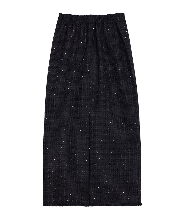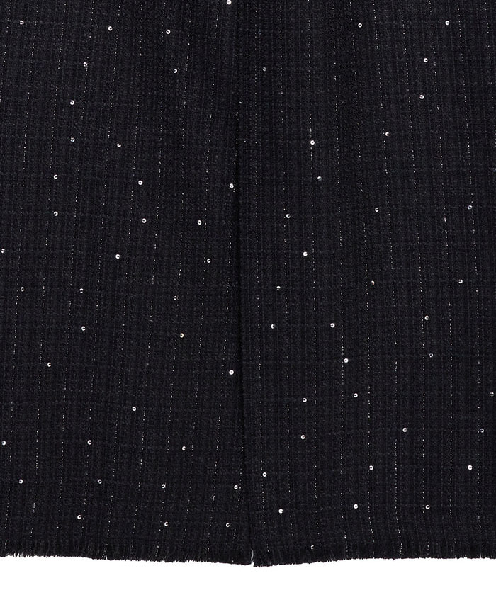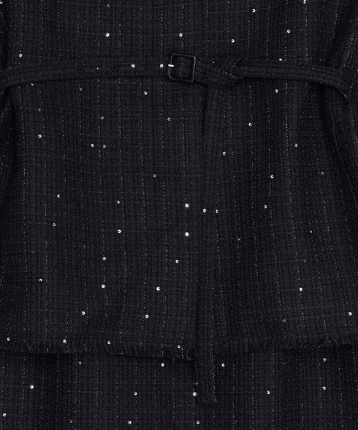 「GLITTER TWEED SET UP」は、ラメツイード素材を用いたトップスとスカートのセットアップです。オリジナルツイードにはラメやスパンコールが織り込まれ、上品な光沢感と華やかさが特徴。トップスは開いたデコルテラインと立体的な袖がデザインポイントで、細ベルト付きでアレンジも自在。スカートはシンプルなIラインシルエットにメロー&フリンジ仕様のディテールをプラスし、こなれ感のあるルックに仕上げています。セットでオケージョンシーンに、単体でデイリーまで幅広く対応します。