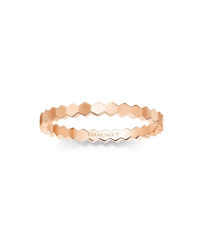 Chaumet を象徴するコレクション「Bee de Chaumet(ビー ドゥ ショーメ)」から、ミツバチの巣を思わせるハニカムモチーフを採用したリング。18Kピンクゴールドの柔らかな色味が肌に馴染み、幾何学的でモダンなデザインが日常のスタイルにも華やぎを添えます。単品での着用はもちろん、他のリングとの重ね付けでも美しく映える、洗練されたジュエリーです。