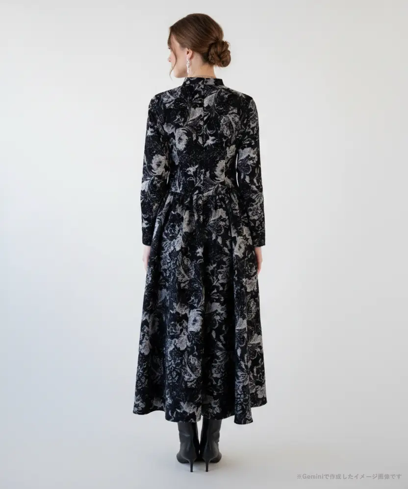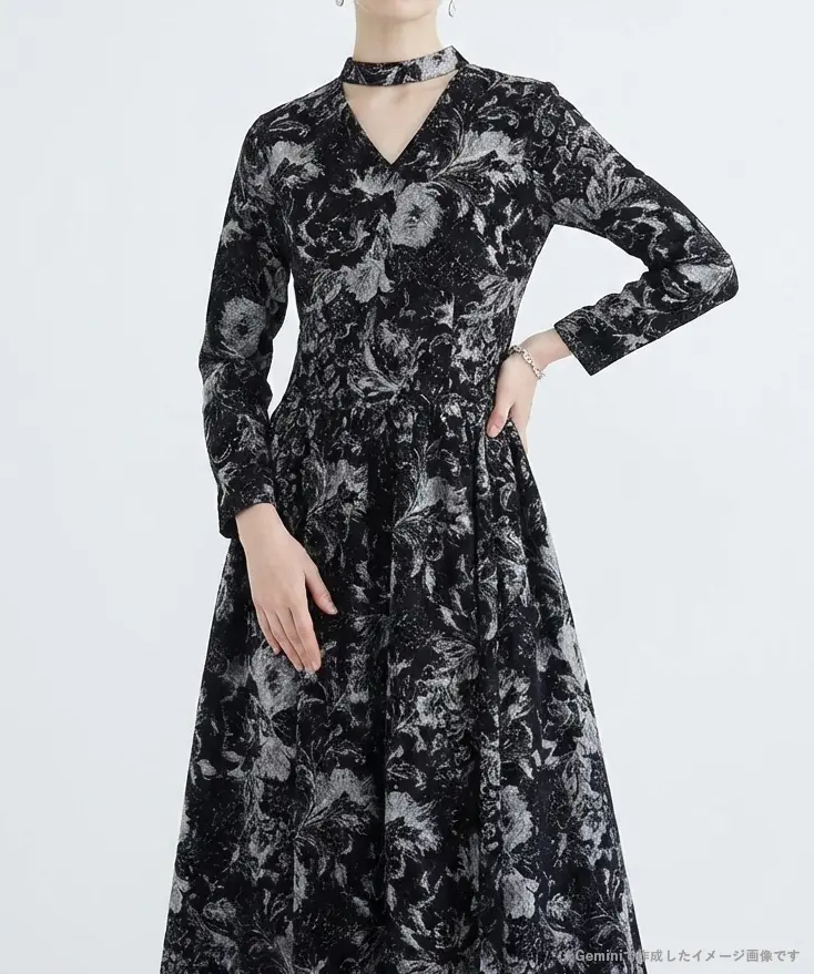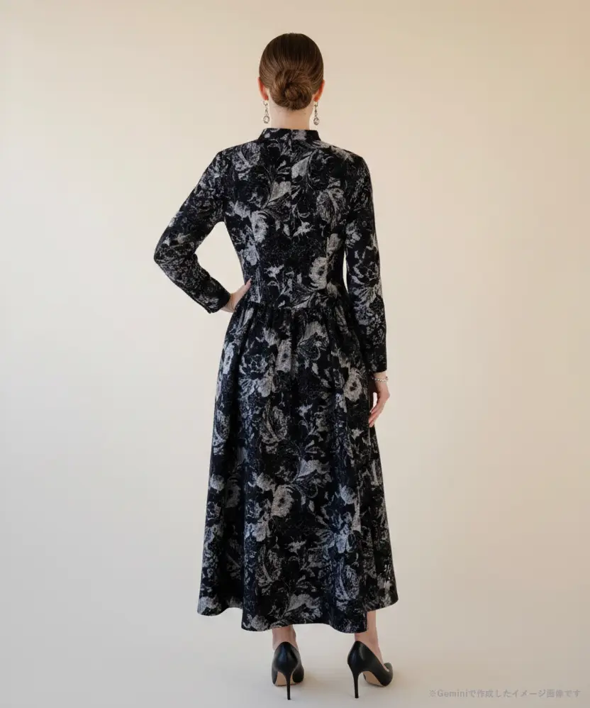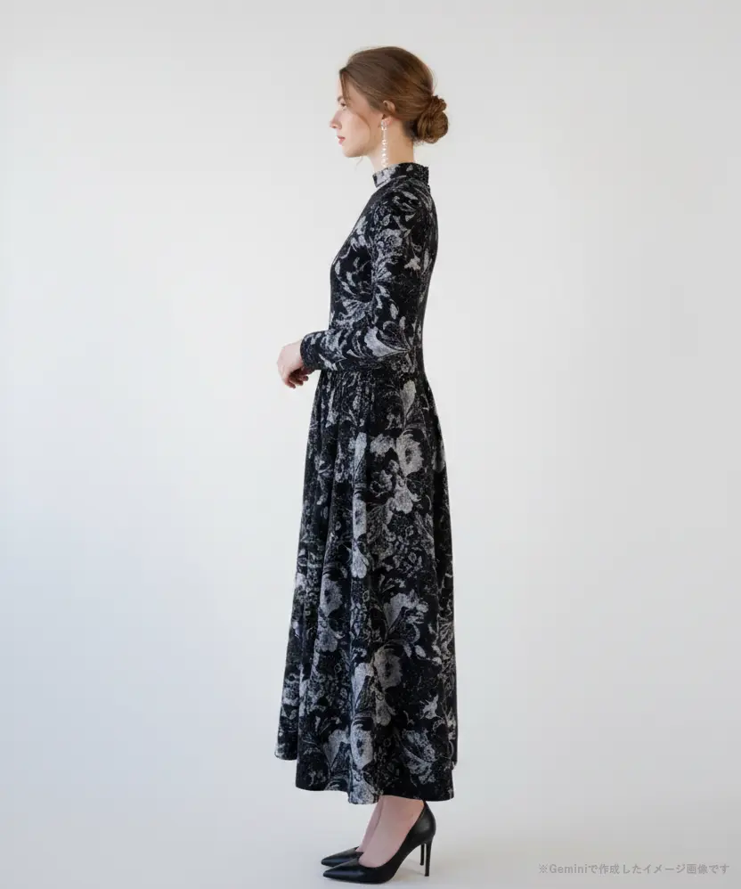総柄×フロッキーの表情が上品で、きれいめにまとめたい日にも頼れるロングワンピです。デコルテがきれいに見えるネックデザインと、上身頃の程よいフィット感で、全体がすっきり見えるのが嬉しいポイント。ウエスト切替から自然に広がるスカートラインで、立体感もきれいに出ます。透け感は基本なし・伸縮性なし・裏地ありなので、安心感のある着心地です。