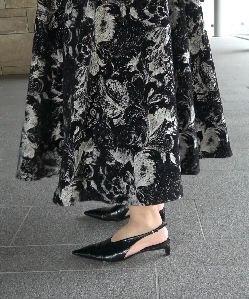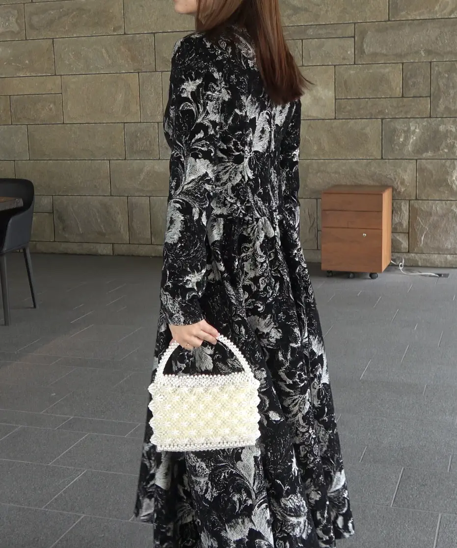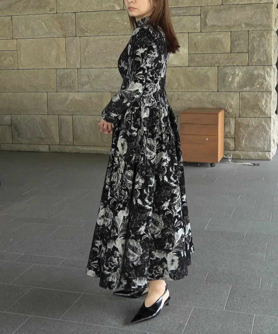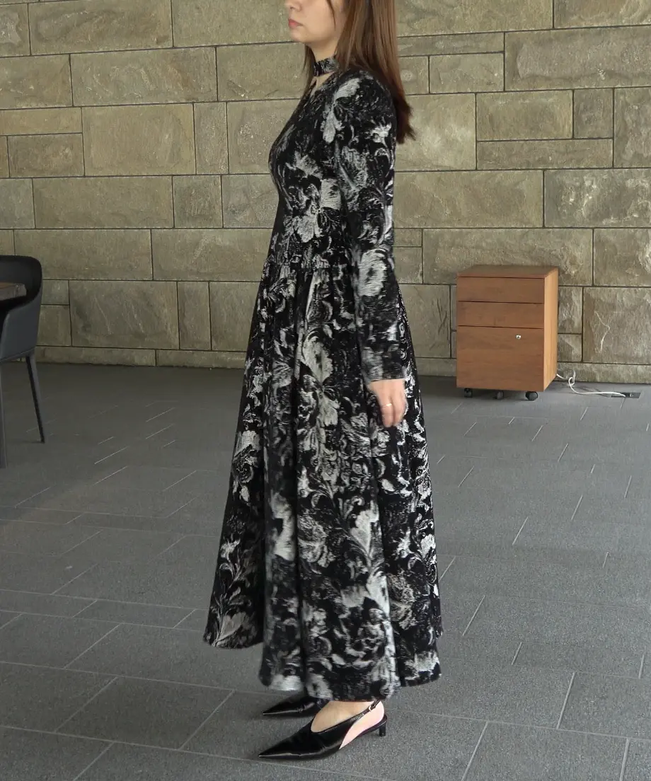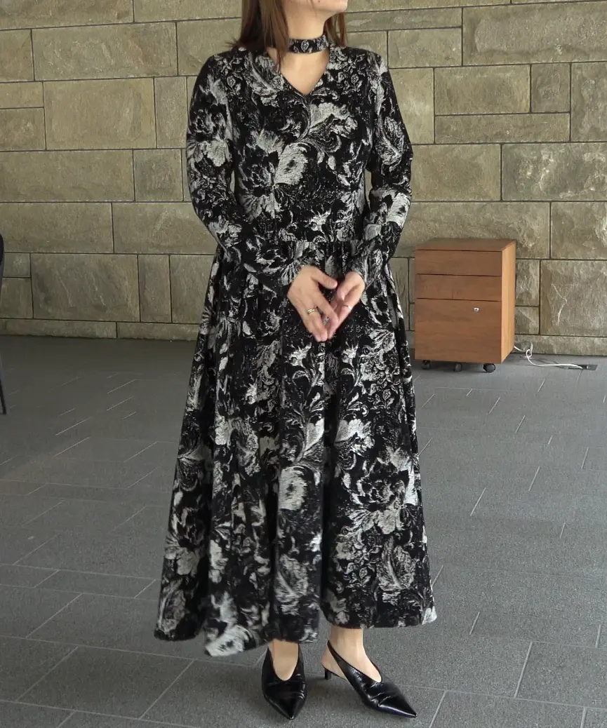 総柄×フロッキーの表情が上品で、きれいめにまとめたい日にも頼れるロングワンピです。デコルテがきれいに見えるネックデザインと、上身頃の程よいフィット感で、全体がすっきり見えるのが嬉しいポイント。ウエスト切替から自然に広がるスカートラインで、立体感もきれいに出ます。透け感は基本なし・伸縮性なし・裏地ありなので、安心感のある着心地です。