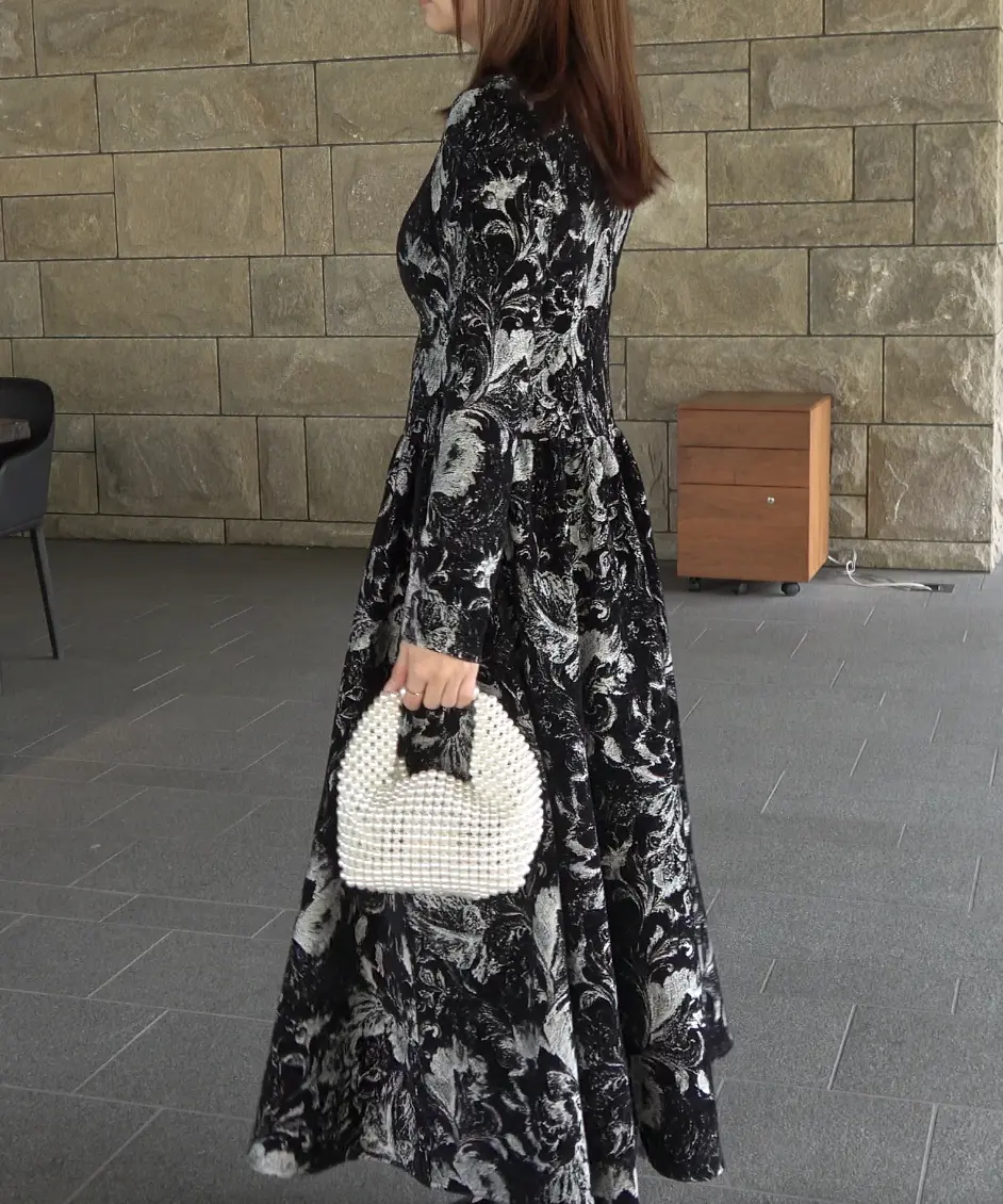 総柄デザインが印象的なクラシックムードのロングドレスです。デコルテを美しく見せるネックラインと、程よくフィットする身頃がバランスよく、ウエスト切替から広がるスカートが自然な立体感を演出します。落ち着いた色合いで1枚でも着用しやすく、きれいめなシーンにも対応できる一着。ポケットはなしです。