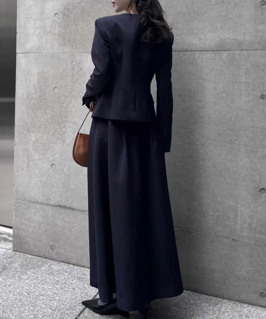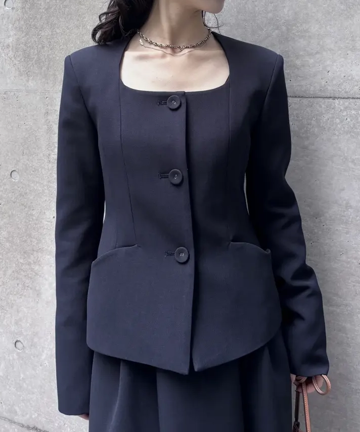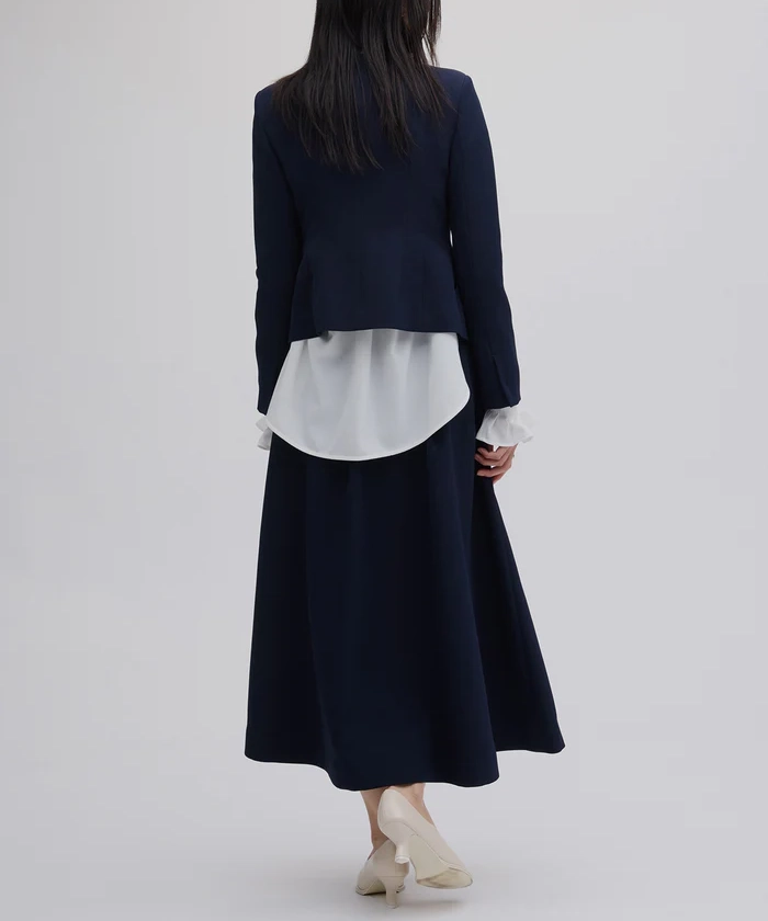 セレモニーやオケージョンで「ジャケット=かっちりしすぎ」を避けたい方におすすめ。ジャケットはスクエアネックでデコルテが綺麗に見え、襟ぐりのリボンは取り外しできるので、式典は上品に・会食は抜け感を出すなど雰囲気を変えられます。スカートは程よいハリでフレアが立体的に広がり、ベルトディテールがスタイルを引き締めてくれます。