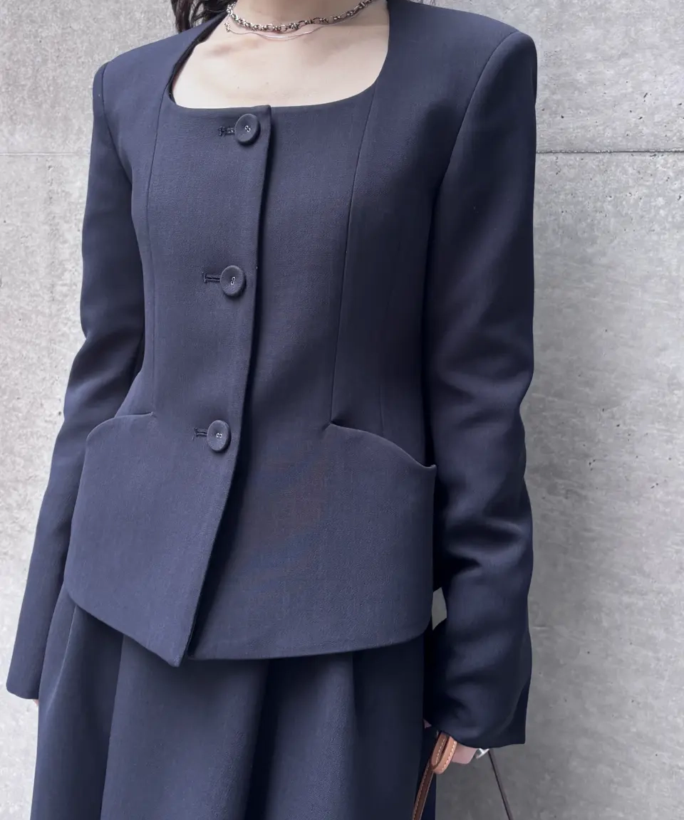 2WAY SQUARE NECK CROP JACKET と BELT SET TUCK FLARE SKIRT を組み合わせた、同素材セットアップ。ジャケットはウエストを程よくシェイプし、腰まわりに丸みを持たせたシルエットで、短丈でもバランスよく決まります。スクエアネックが顔まわりをすっきり見せ、ポケットのハートカットや裏地ジャガードなど、近くで見たときのディテールもポイント。スカートはベルトディテールがアクセントになり、切り替えを活かしたポケットデザインで立体感のある仕上がりです。結婚式、オケージョン、セレモニー、オフィスまで幅広く活躍します。