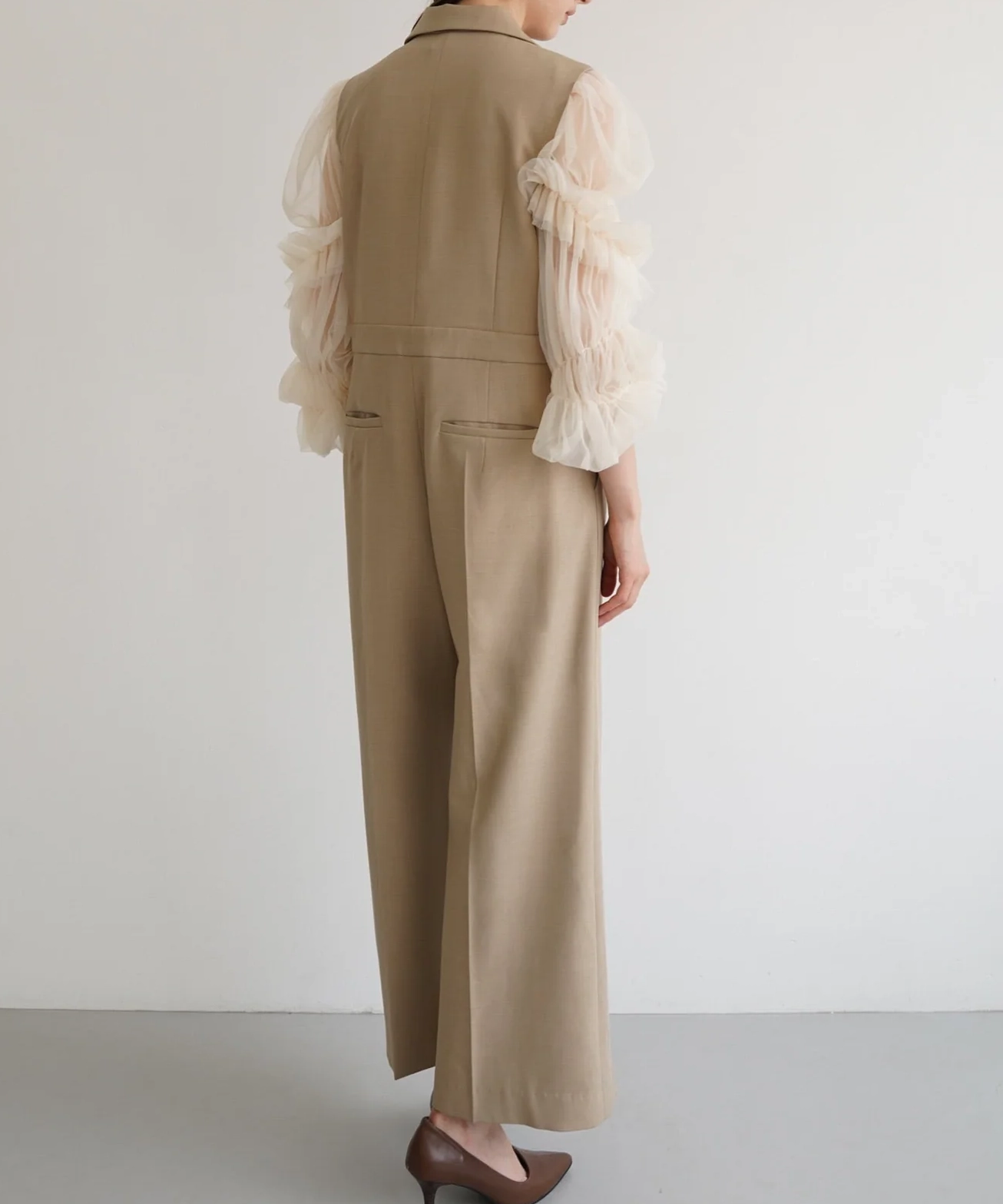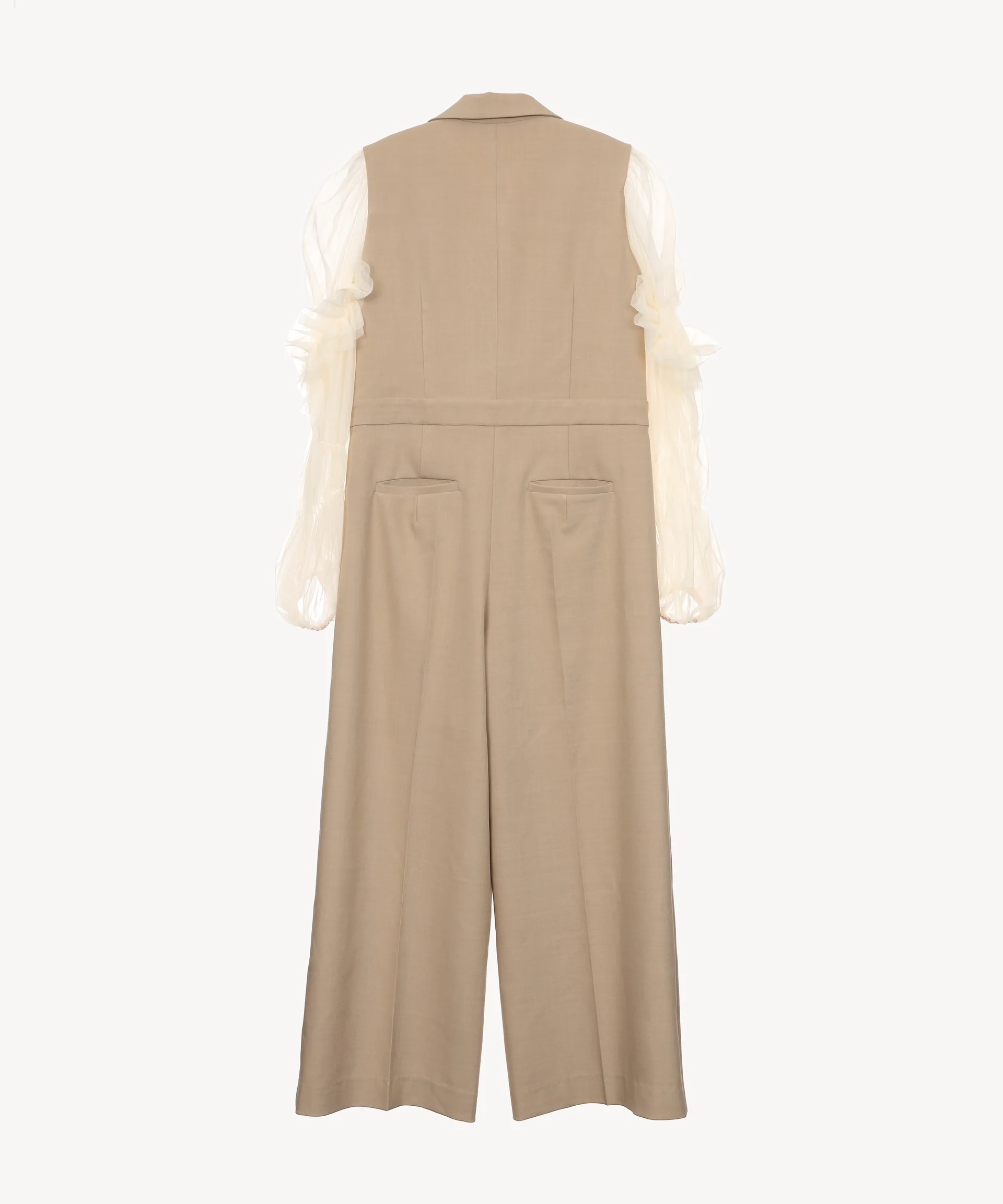 シックなダブルボタンのオールインワンに、華やかなチュールブラウスがセットになった“きちんと感×抜け感”のバランスが絶妙な1着です。オールインワンはノースリーブですっきり見え、ウエスト周りもきれいに整うシルエット。チュールトップスはふんわりギャザーとボリューム袖で、二の腕をさりげなくカバーしつつ写真映えも◎。結婚式や二次会、ホテルディナーなどきれいめシーンはもちろん、オールインワン単品でジャケットを羽織ればオケージョン以外にも活躍します。