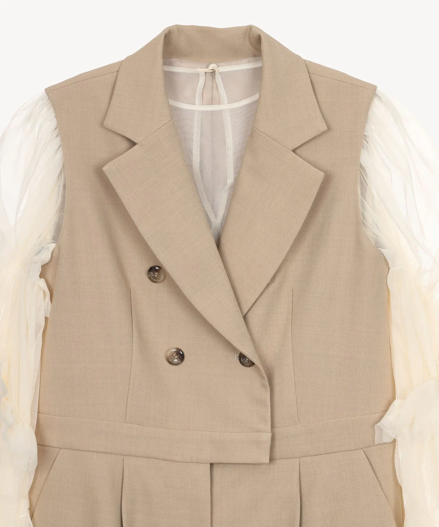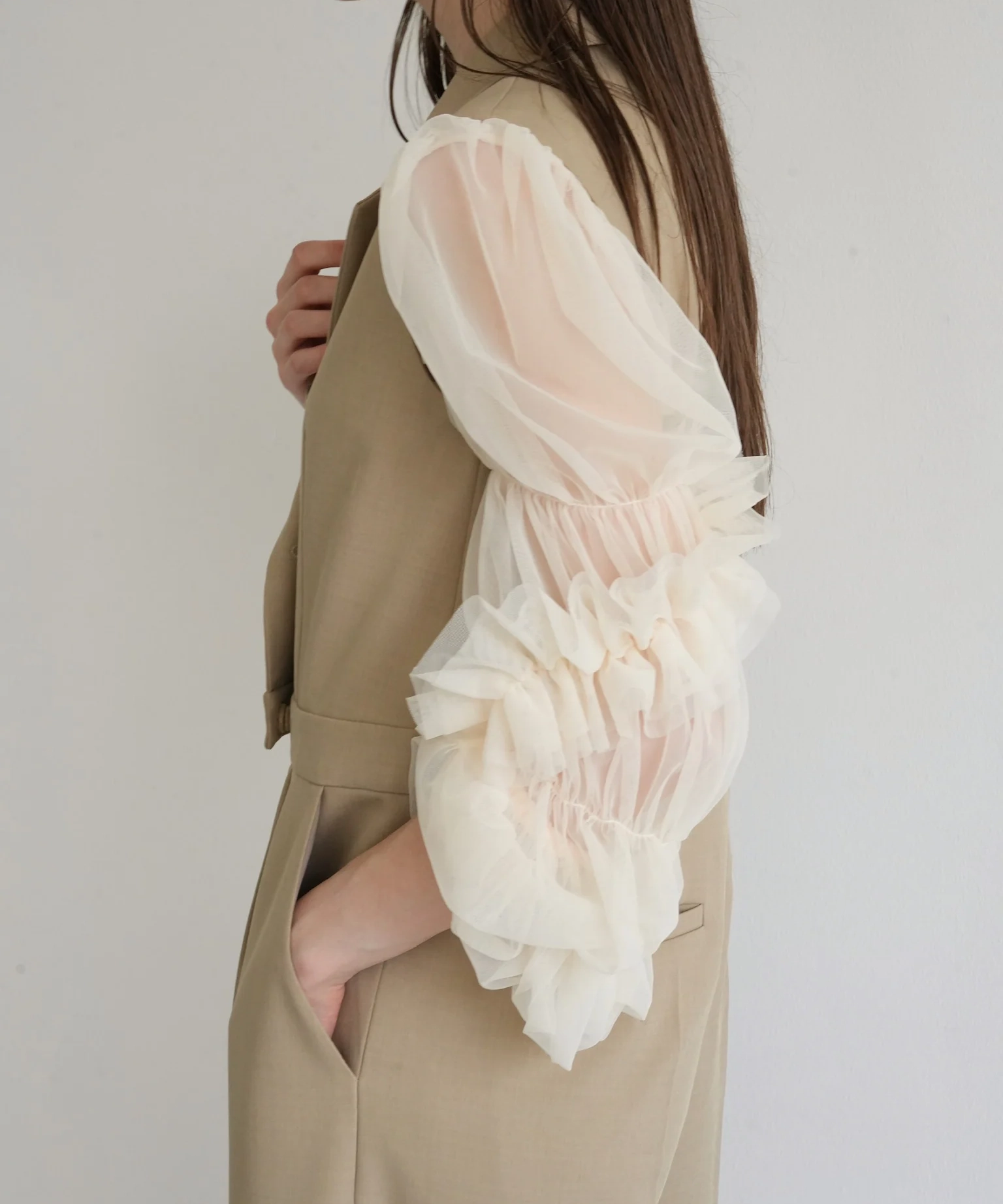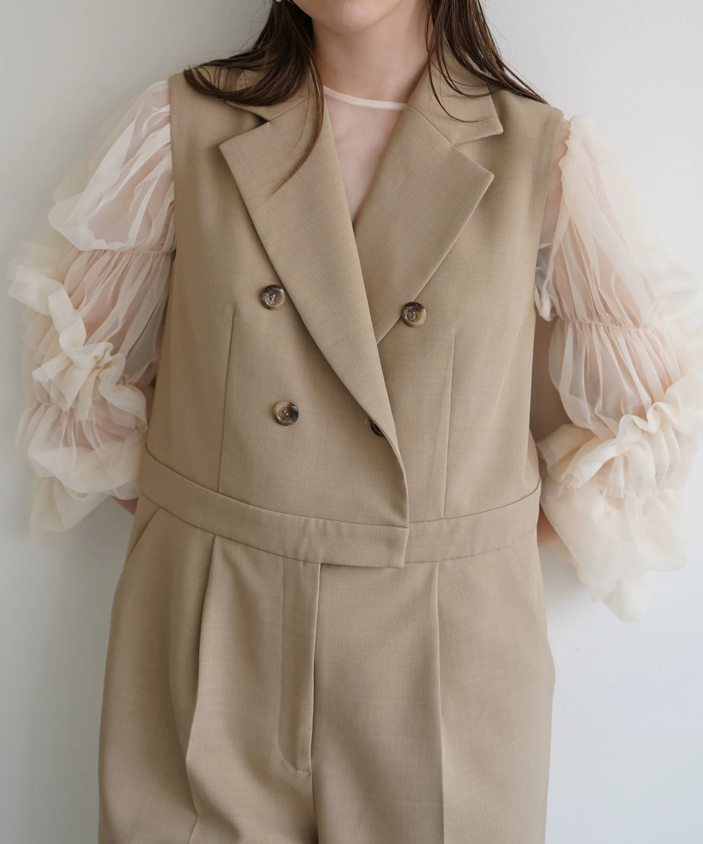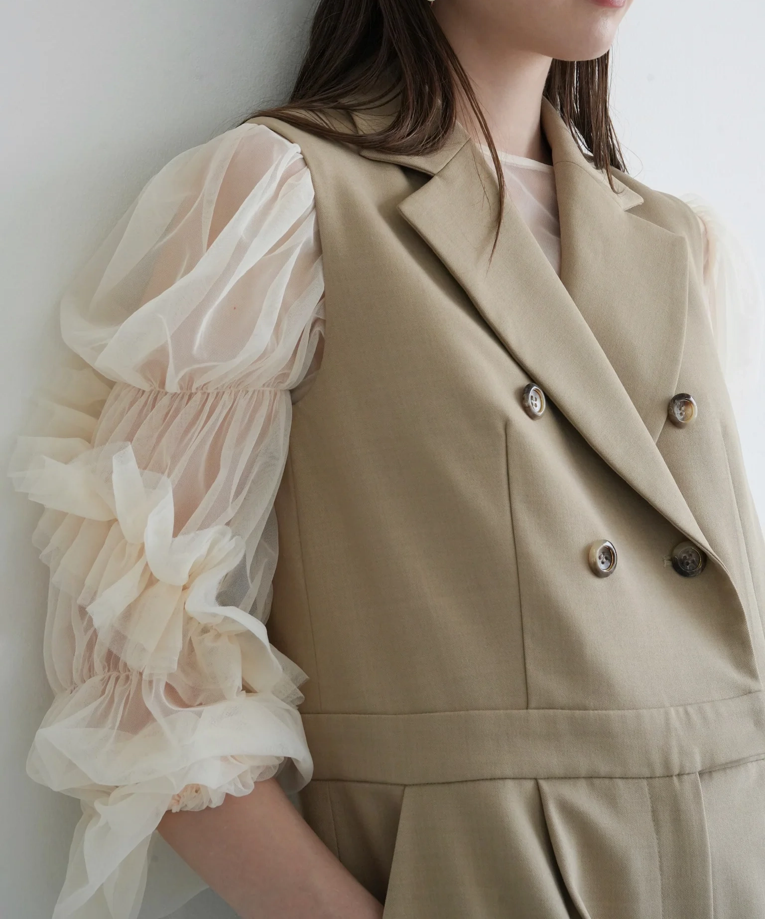ダブルボタンデザインのオールインワンと、繊細なチュールブラウスを組み合わせたセットアイテムです。オールインワンはシンプルなノースリーブ仕様で、インナー次第で印象チェンジが可能。セットのチュールブラウスは透け感のある軽やかな素材とギャザーディテールで、女性らしい華やぎをプラスします。それぞれ単品でも着用でき、チュールブラウスはデニムやスカートに合わせてカジュアルダウン、オールインワンはニットやブラウスをインしてきれいめにも着回せます。トップス部分は透け感があるため、インナーはベアトップやキャミソールなどすっきりしたものがおすすめです。