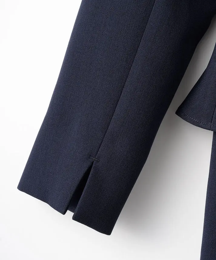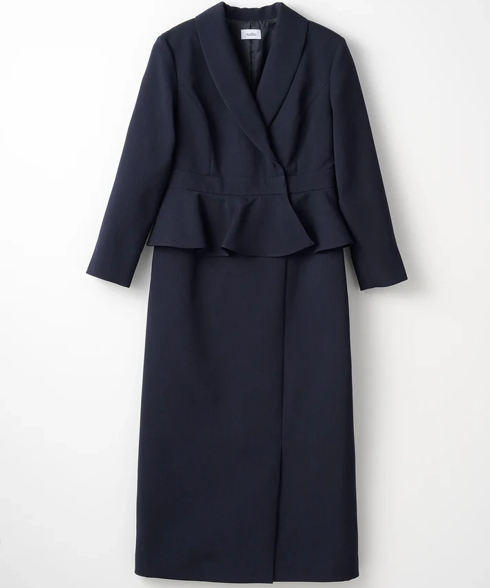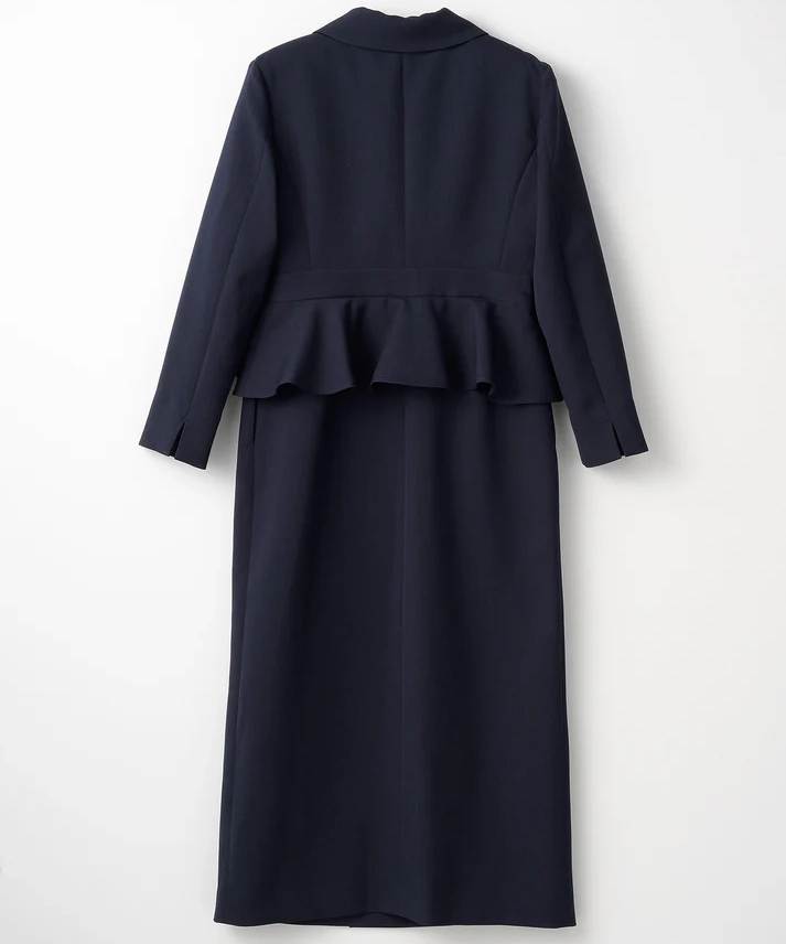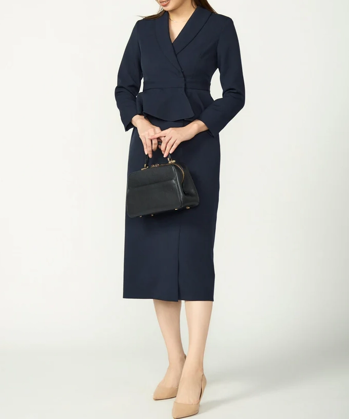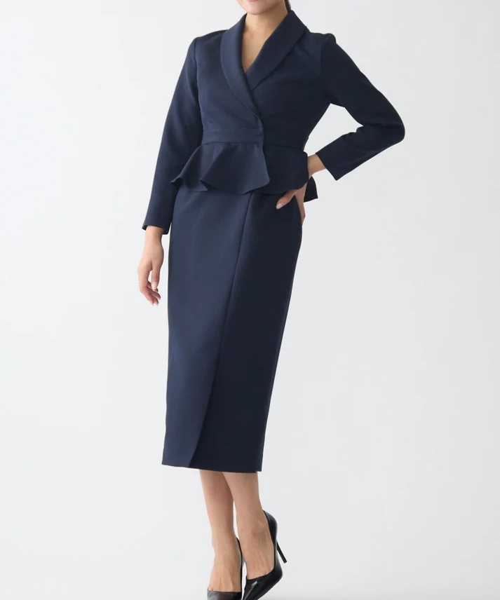 ネイビーは“きちんと感”と上品さがしっかり出るので、結婚式はもちろん、入学式や式典、ホテル会食などフォーマル寄りのシーンにも使いやすいカラーです。ペプラムの立体感でウエスト位置が高く見え、自然にスタイルアップ。セパレート風のデザインなので、程よく抜け感もありつつ、1枚で完成するのが嬉しいポイントです。フロントスリット入りで足さばきが良く、両サイドポケット付きで実用性も◎。