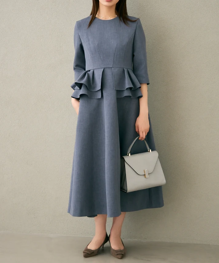 二段に重ねたペプラムがしっかり主役になるのに、グレーの落ち着きで甘さ控えめにまとまる1着です。ハリコシのある生地で立体感がきれいに出るので、ウエスト位置が自然に高く見えてスタイルアップ効果も◎。袖は七分丈で腕まわりがすっきり見え、結婚式や式典、ホテル会食など“きちんと感”が必要なシーンにもおすすめです。スカートはフレア分量たっぷりで動くたびに華やかさが出るので、写真映えも狙えます。