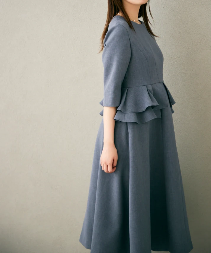 二段に重ねたペプラムデザインが特徴的なドレスです。しっかりとしたハリコシのある生地が立体的なディテールを引き立て、自然にウエストラインを美しく見せます。袖は七分丈で上品なバランスに仕上げ、スカートはフレア分量をたっぷり入れることで、歩くたびに立体感のあるシルエットを演出。透け感なし、裏地あり、伸縮性なしの仕様です。