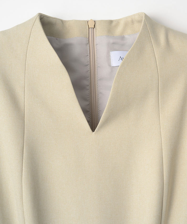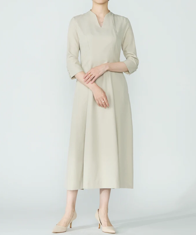 “キャサリンワンピ”のベージュは、肌なじみが良く写真でも顔まわりが明るく見えるのが魅力です。ウェービーなネックラインが上品で、派手すぎないのにきちんと華やぐので、結婚式や二次会、ホテルディナー、両家顔合わせなどにもおすすめ。見た目以上に軽く柔らかな生地で着心地が良く、襟ぐりの開きも絶妙なのでお辞儀のシーンでも安心です。背中のコンシールファスナーが大きく開いて足元から着られる仕様のため、ヘアメイク後でも着替えやすい“時短ドレス”としても活躍します。