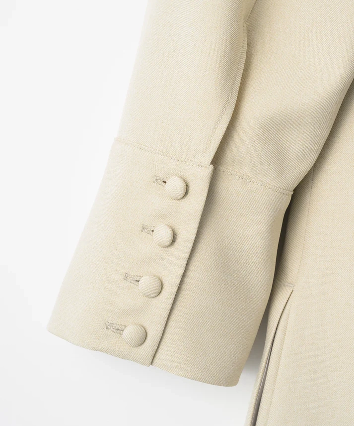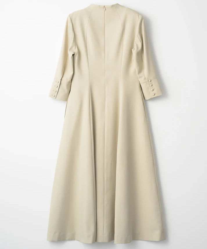 昼でも夜でもシーンを問わず着用できる、上品なフレアシルエットのドレスです。ウェービーな首元がロイヤルな雰囲気を漂わせ、肘くらいの長さに調整した袖と、さりげないくるみボタンが洗練された印象に。着脱は背中のコンシールファスナーで、ファスナーが大きく開くため足元から着用でき、メイクやヘアセット後でもスムーズにお着替えできます。