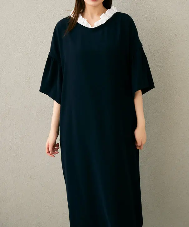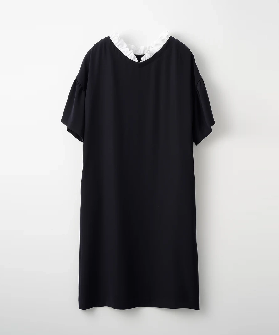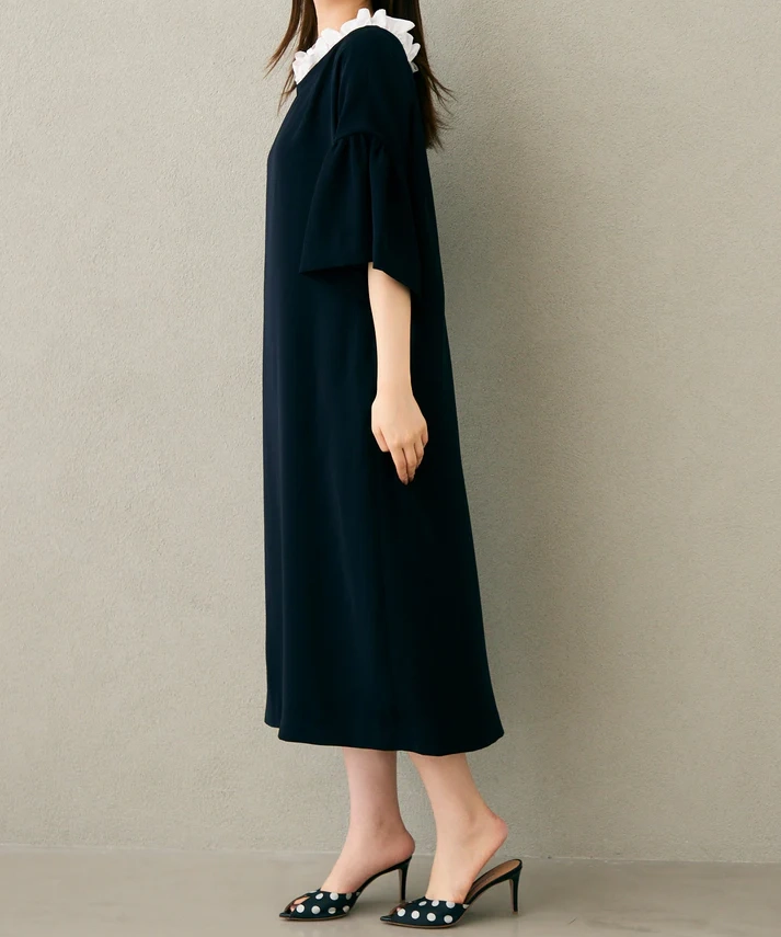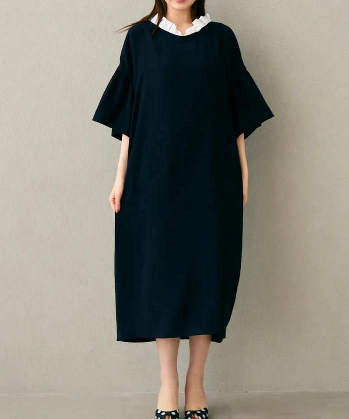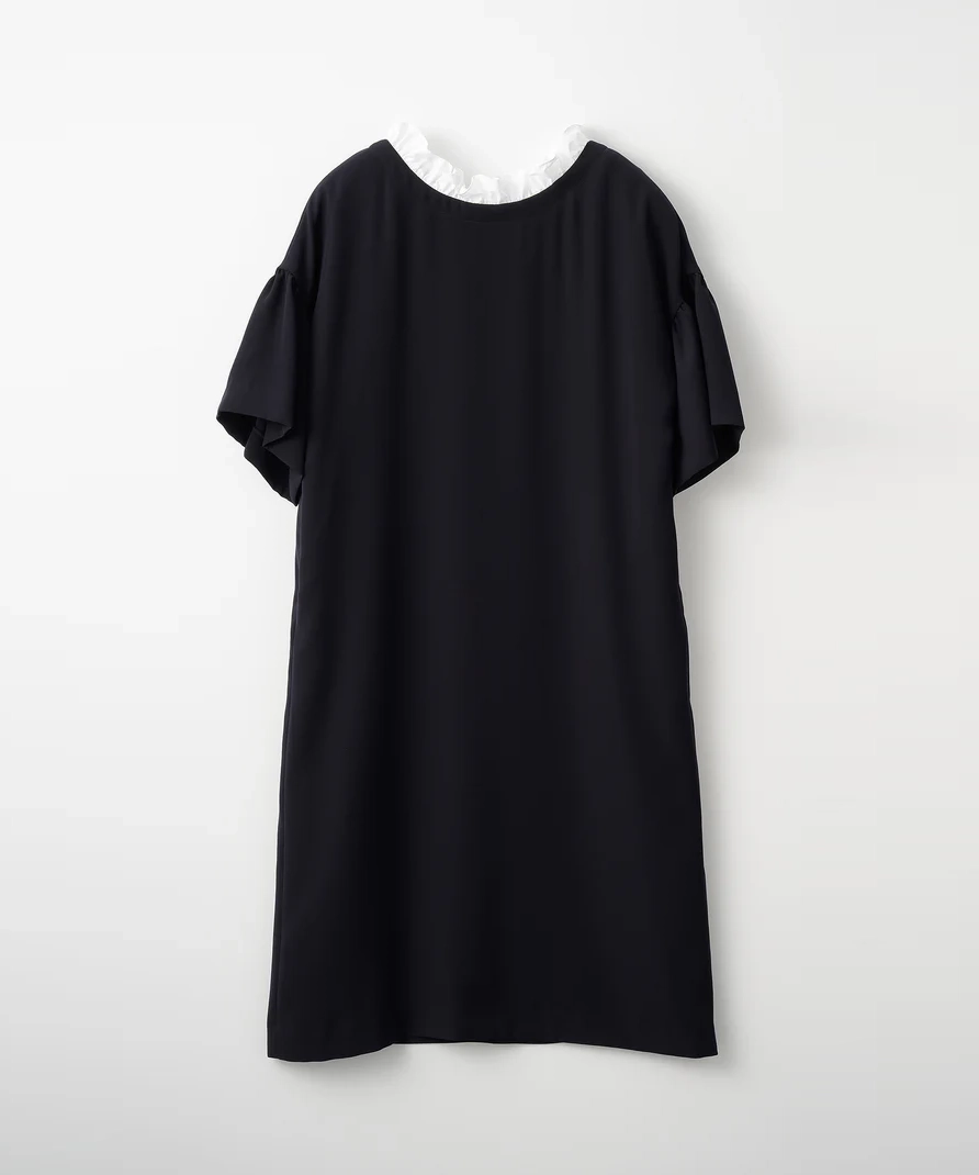 ボートネックにフリルをあしらったワンピース。前後どちらを前にしても着用できる2way仕様です。袖はやや広がりのあるデザインで腕まわりにゆとりがあり、全体はリラックス感のあるAラインシルエットで締め付け感なく着用できます。透け感なし、裏地あり、伸縮性なし。