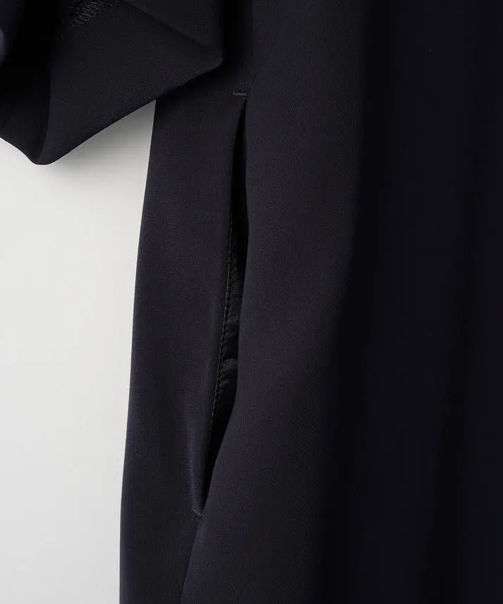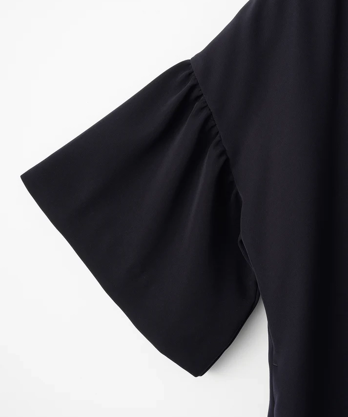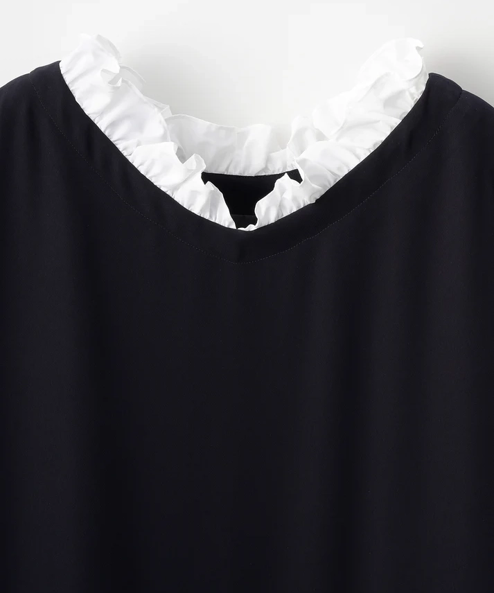 ブラックはフリルデザインでも甘くなりすぎず、引き締まった印象で着られる万能カラーです。ボートネック×フリルで顔まわりに華やかさを出しつつ、全体はゆったりAラインで身体のラインを拾いにくいのが嬉しいポイント。前後どちらを前にしても着られる2way仕様なので、ネックの見え方を変えて雰囲気チェンジもできます。袖もゆとりがあり、長時間の式や会食でもラクにきれい見えします。