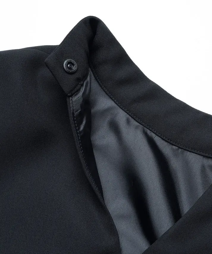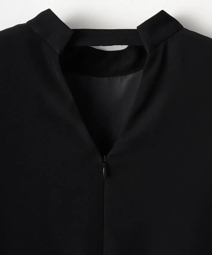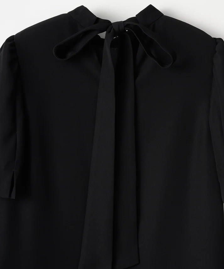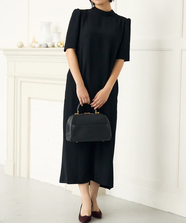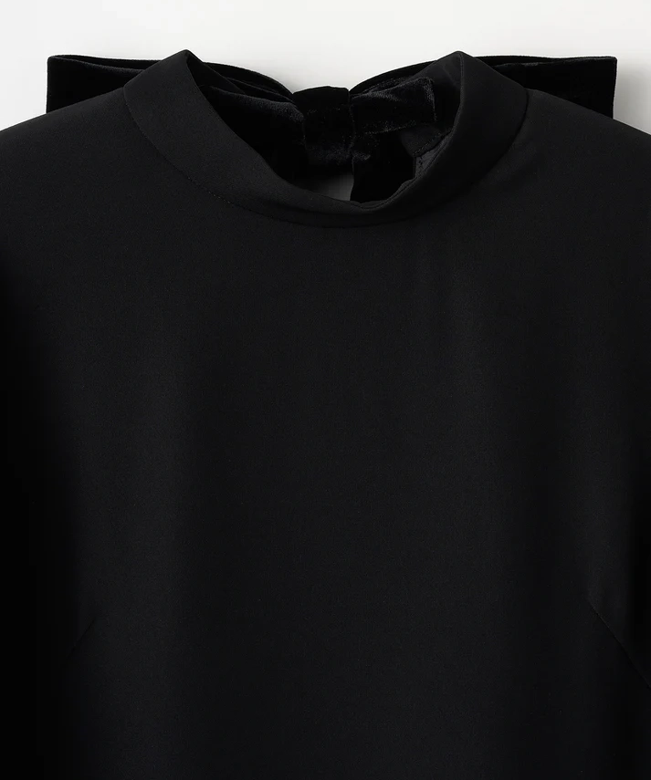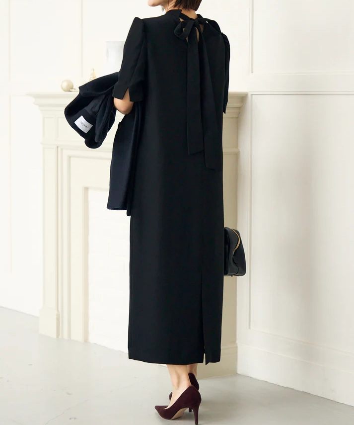ストンと落ちるIラインで大人っぽく決まるのに、リボンで印象を変えられる“着回し上手”なドレスです。ブラックは甘さが出にくく、リボンのベロアの光沢がさりげないアクセントに。肩のパフスリーブで立体感が出るので、1枚でも写真映えします。結婚式や二次会、ホテルディナーなどきちんとシーンはもちろん、リボンを控えめにすれば会食や式典にも使いやすいです。