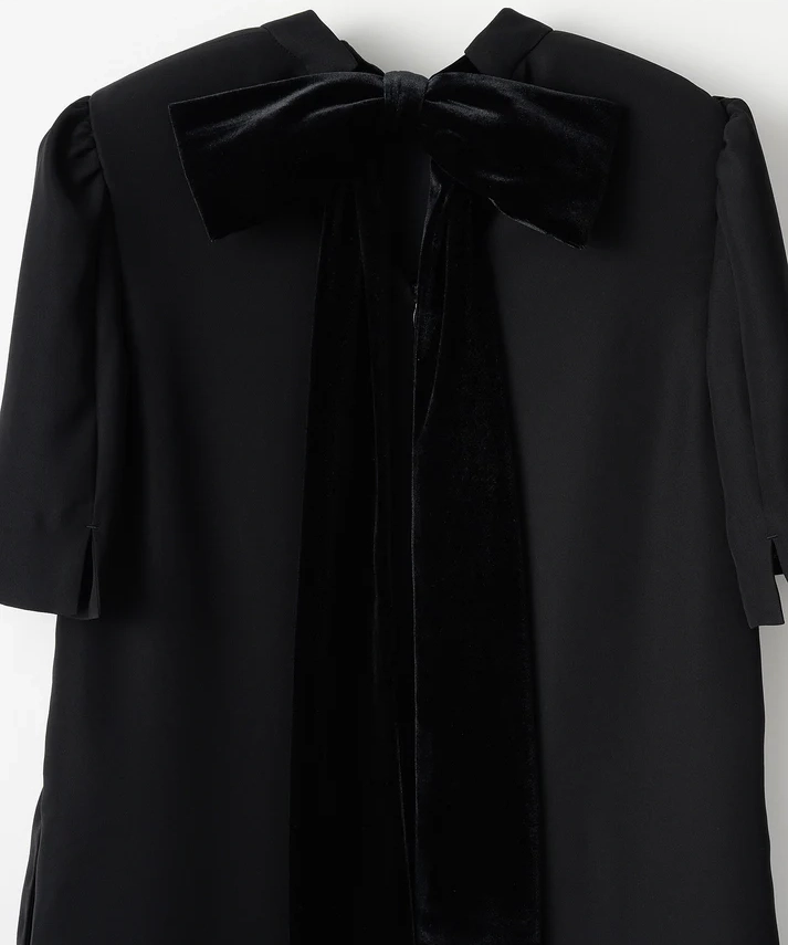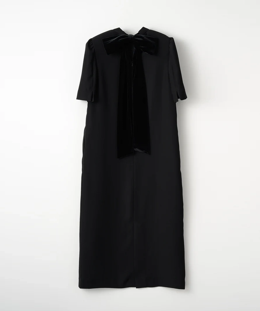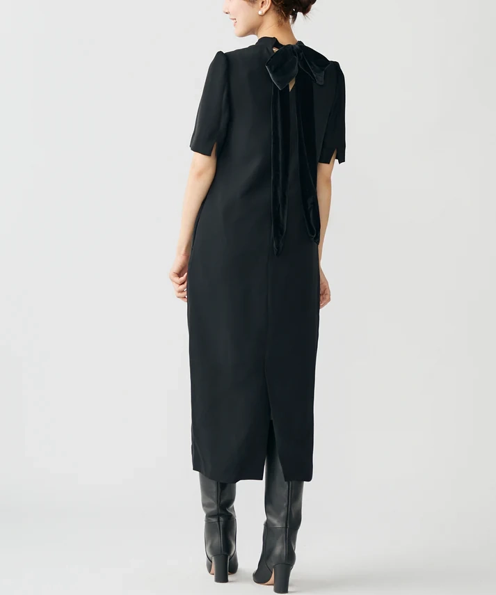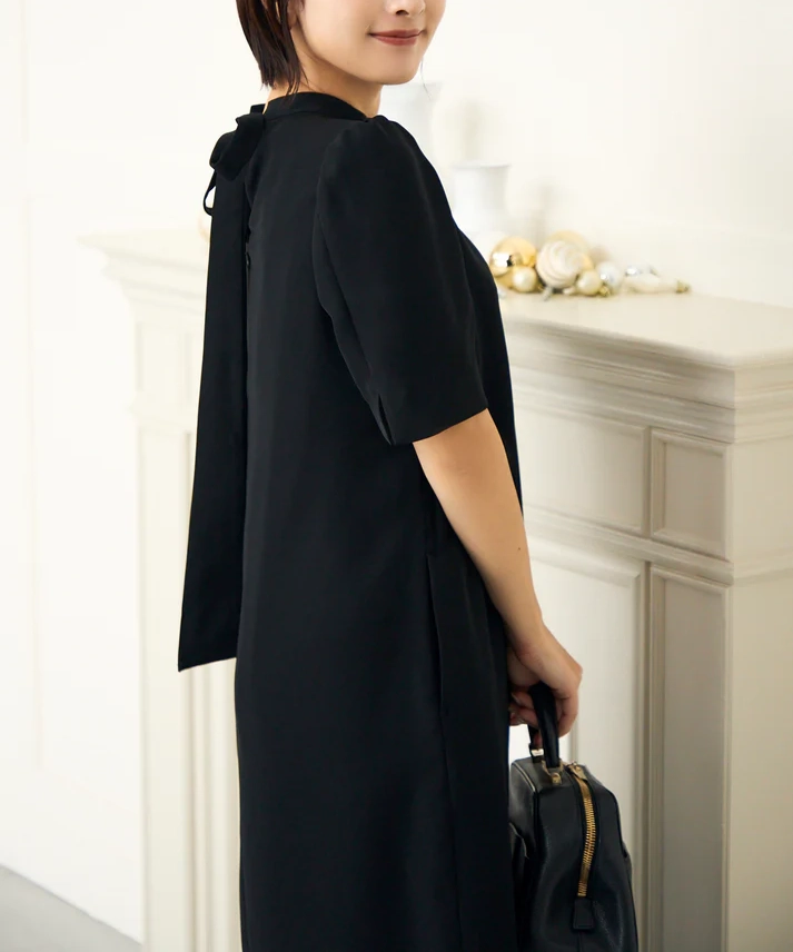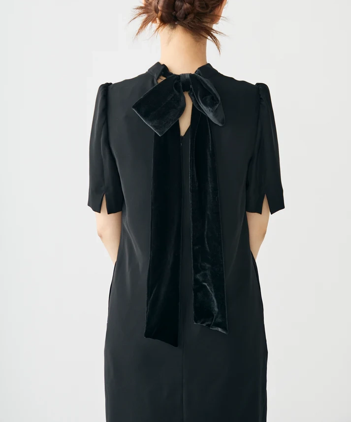 ストンと落ち感のあるIラインシルエットのドレス。リボンはスタイルに合わせて付け替えができる3パターン仕様で、着こなしの幅が広がります。肩にはさりげないパフスリーブを施し、立体感のある印象に。ブラックのリボンは光沢感のあるベロア素材で、上品なアクセントになります。透け感なし/裏地あり/伸縮性なし。リボンは取り外し・付け替え可能で、洗濯機の使用も可能です(詳細は洗濯表示をご確認ください)。