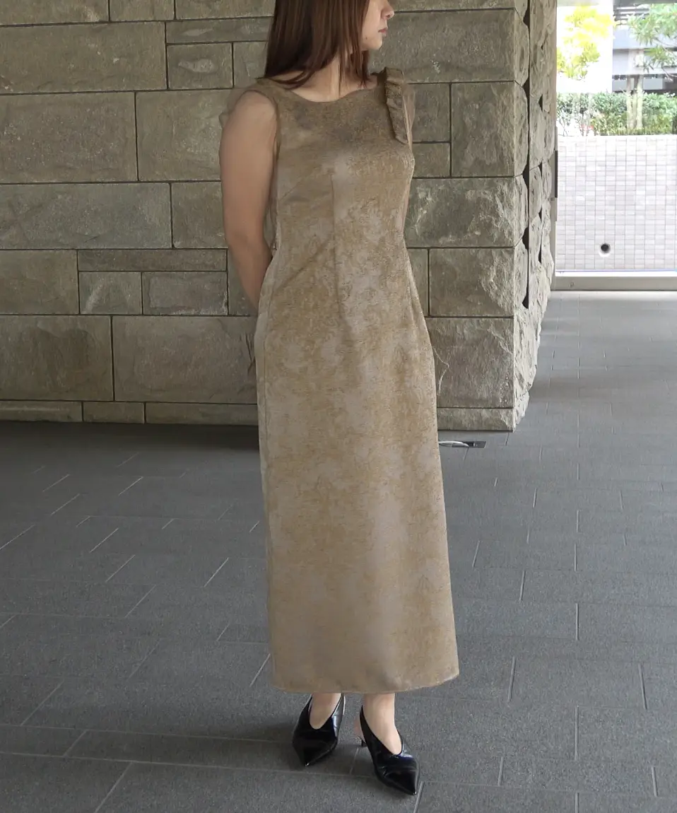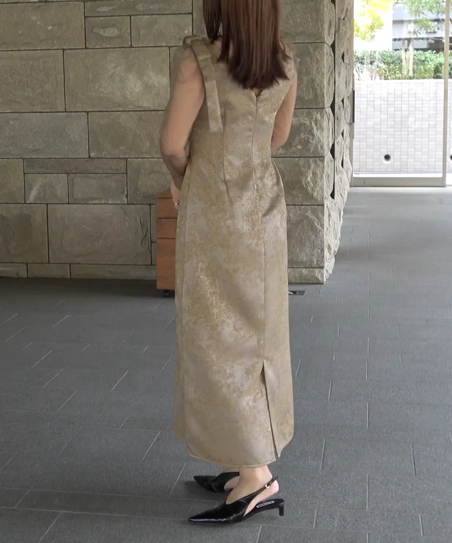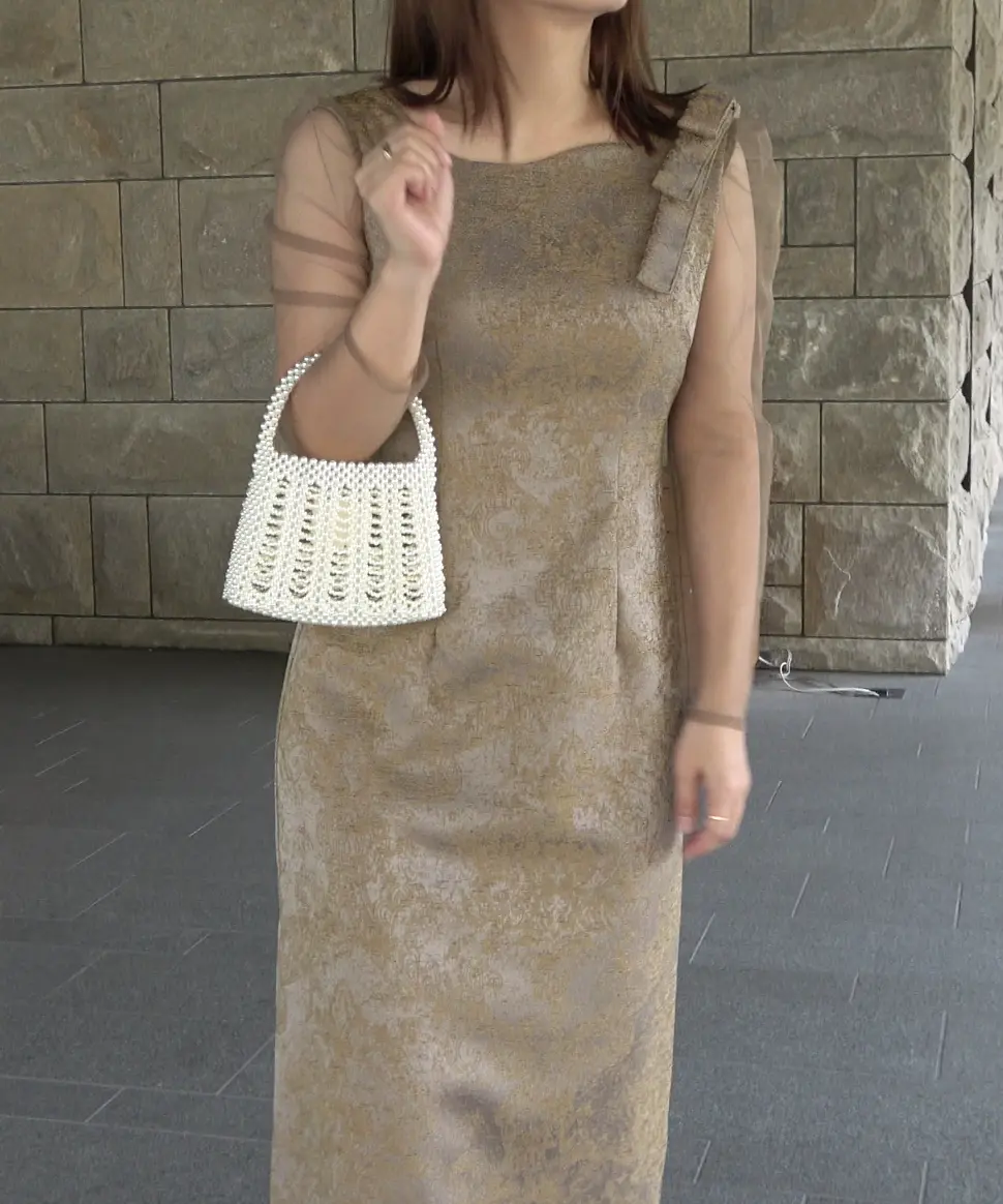 ’25 AWのジャガードドレスを、オールシーズン着られる仕様にアップデートした一着です。上品に仕立てたジャガード生地は、カラーごとに素材映えと華やかさが叶うのがポイント。ショルダー部分の立体リボンでトレンド感を添え、袖には柔らかなチュールを採用して軽やかな抜け感を演出します。バックファスナー仕様で着脱しやすく、バックスリット入りで足さばきも◎。