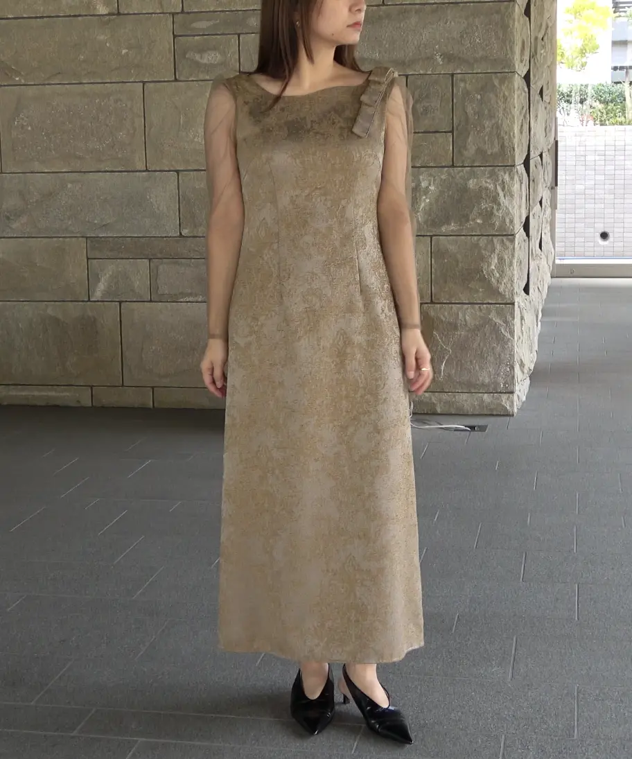 ’25 AWのジャガードドレスを、オールシーズン着られる仕様にアップデートした一着です。上品に仕立てたジャガード生地は、カラーごとに素材映えと華やかさが叶うのがポイント。ショルダー部分の立体リボンでトレンド感を添え、袖には柔らかなチュールを採用して軽やかな抜け感を演出します。バックファスナー仕様で着脱しやすく、バックスリット入りで足さばきも◎。