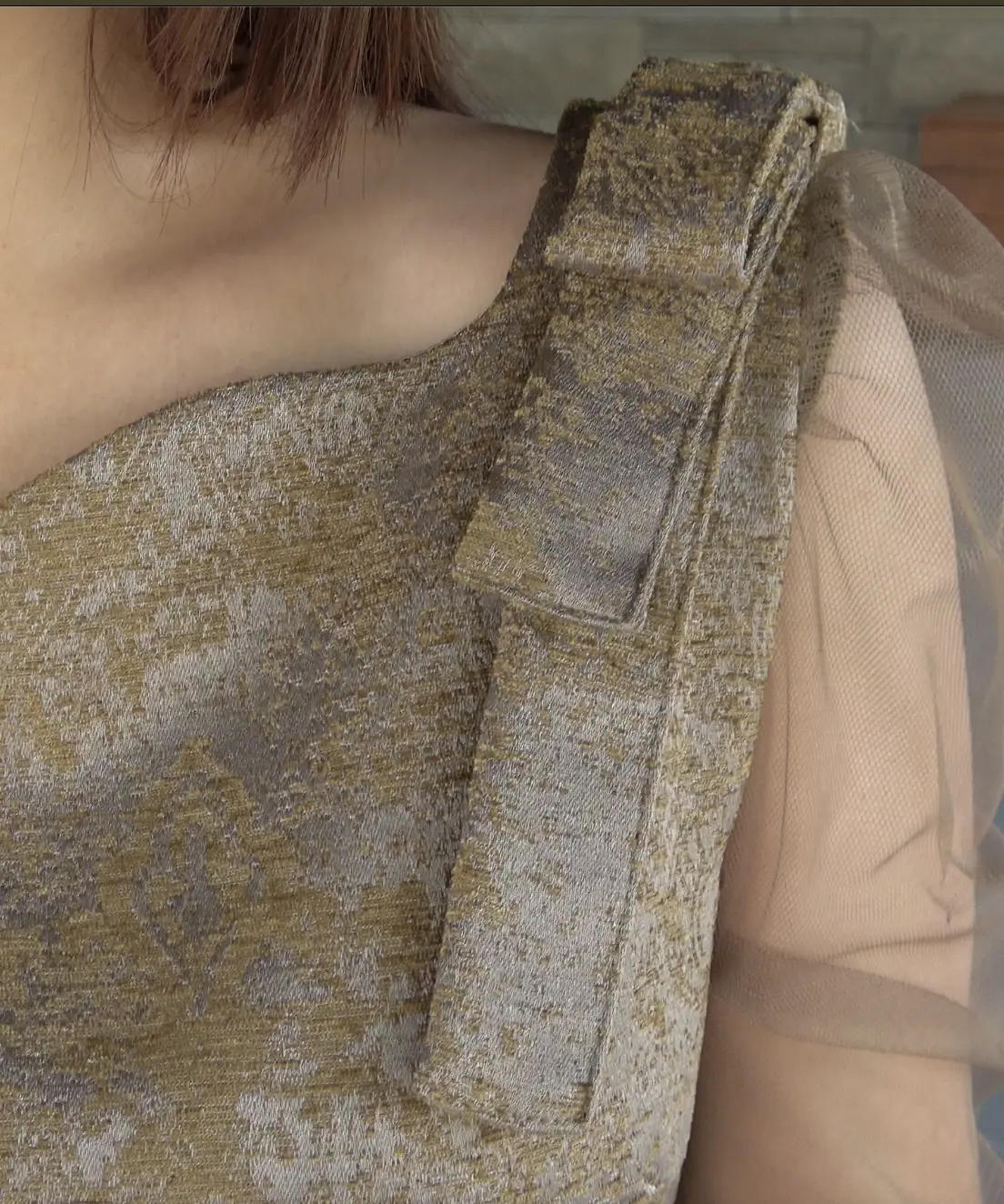 後ろにスリットがあるので歩きやすいですが、大股で歩くと裂けてしまうかもしれないので気をつけたいです。二の腕は、チュールがあるものの、肌と同じ色味なので、二の腕の太さが気になる方は少し抵抗があるかもしれません。