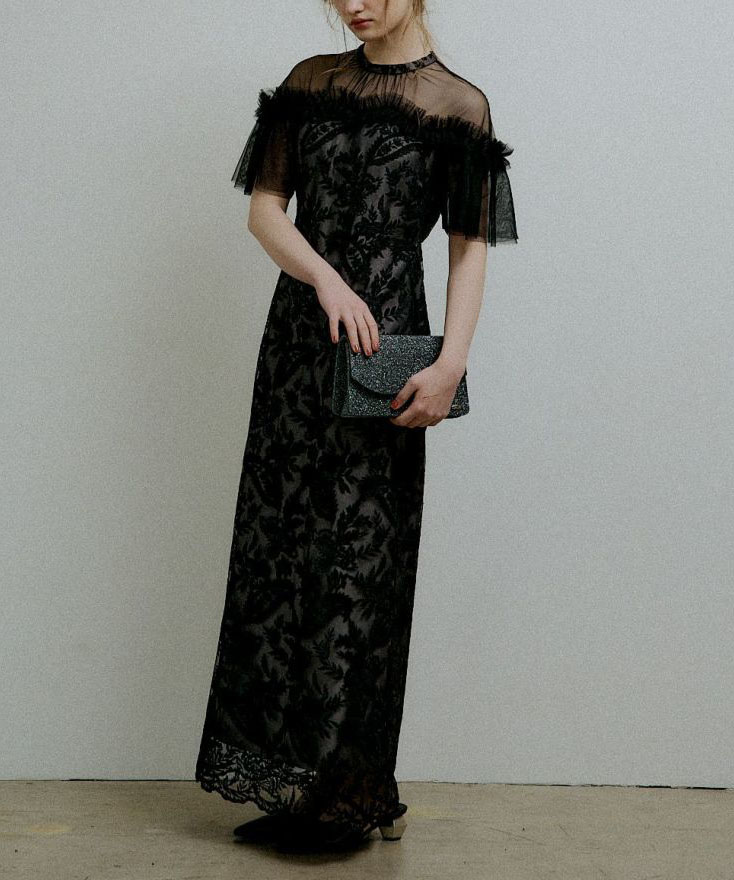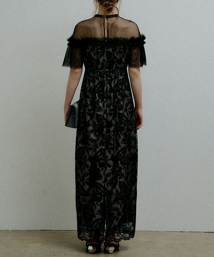 繊細なペイズリー刺繍が映えるレースドレス。2層チュールを使用した袖で華やかさをプラスし、うねりを効かせたデコルテのフリルデザインでLE’RUREらしい個性を添えています。首元はハイネック仕様で、レースドレスを大人っぽく引き締めるバランスに。バックファスナー仕様で着脱しやすく、袖部分は透け感があります。お手入れはクリーニング店へご相談ください。