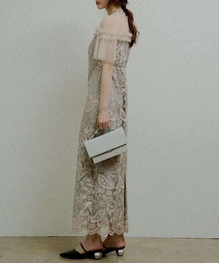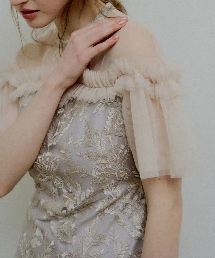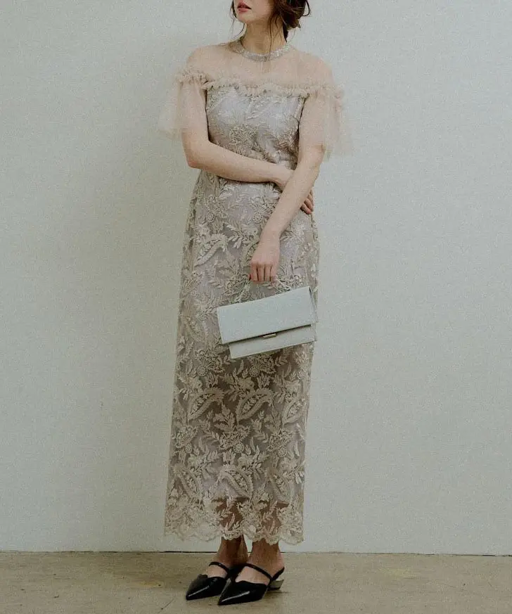 繊細なペイズリー刺繍がぱっと目を惹く、LE’RUREらしい“ひと癖レース”の主役ドレスです。2層チュールの袖がほどよいボリューム感を出して、腕まわりをふんわりカバーしつつ写真映えも◎。デコルテのうねりフリルが他にないポイントですが、首元はすっきりハイネックなので甘くなりすぎず、大人っぽく締まります。結婚式や二次会はもちろん、成人式・同窓会・演奏会など華やぎが欲しいシーンにもおすすめです。