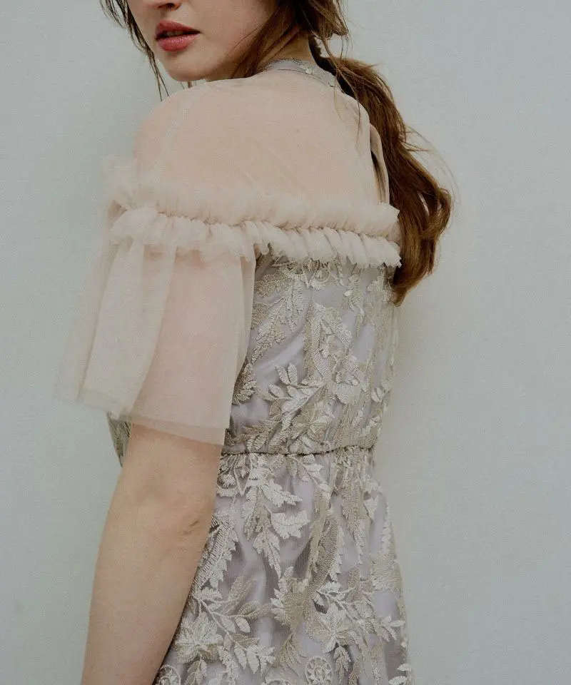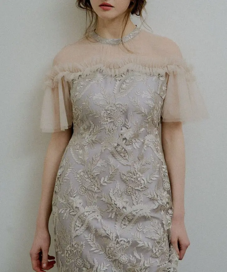 繊細なペイズリー刺繍が映えるレースドレス。2層チュールを使用した袖で華やかさをプラスし、うねりを効かせたデコルテのフリルデザインでLE’RUREらしい個性を添えています。首元はハイネック仕様で、レースドレスを大人っぽく引き締めるバランスに。バックファスナー仕様で着脱しやすく、袖部分は透け感があります。お手入れはクリーニング店へご相談ください。