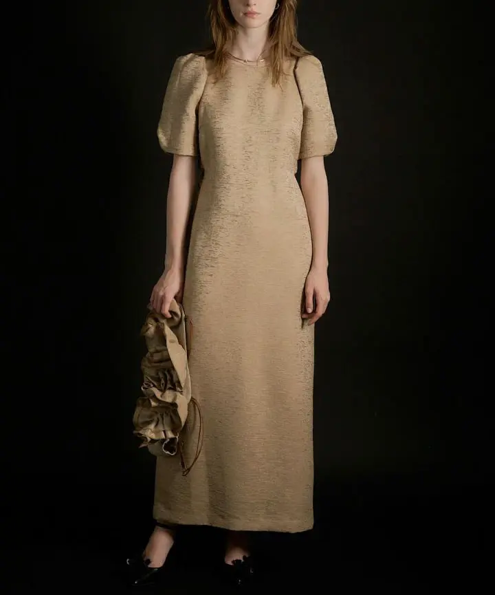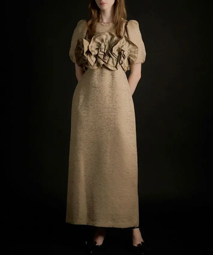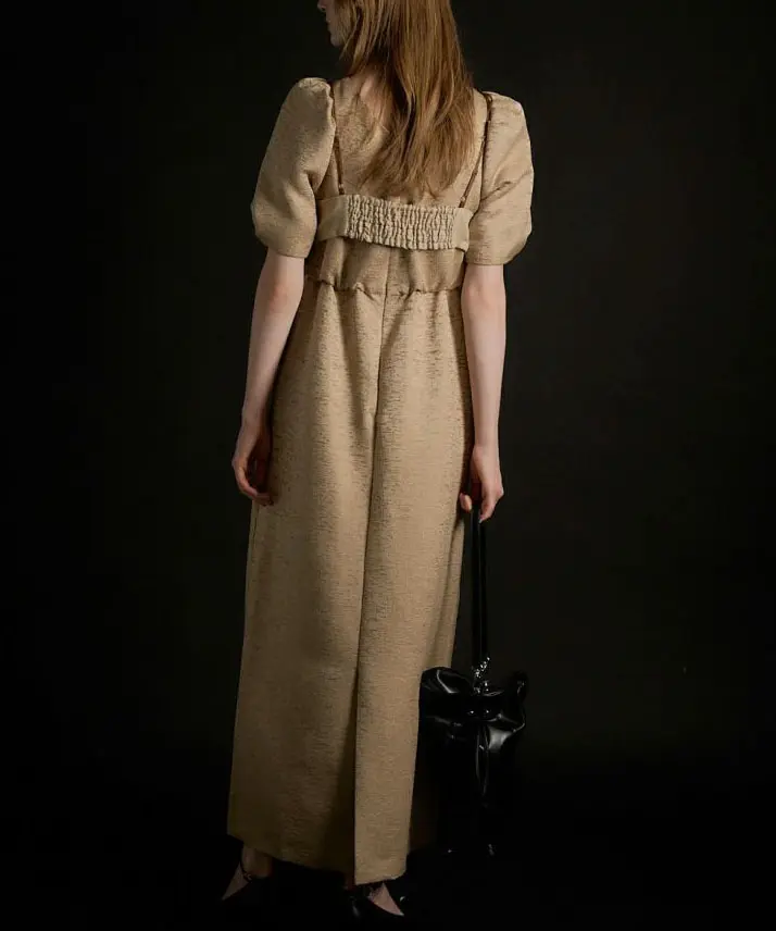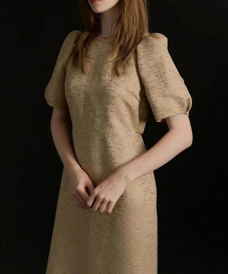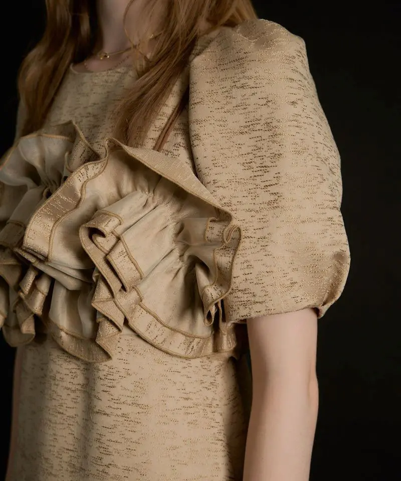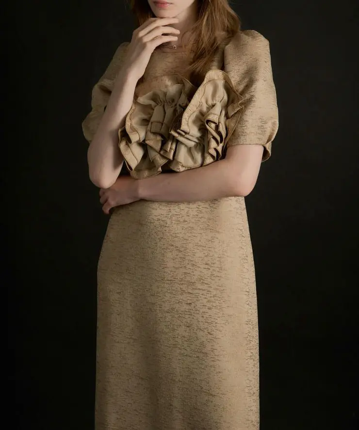 ニュアンスたっぷりのウェーブフリルビスチェと、ジャガードワンピースのセットアイテム。ジャガードはオールシーズン使いやすい単色で、素材の凹凸感が立体的に見えるのが魅力です。ワンピースはハリ感を活かしたコクーンシルエットで1枚でも様になり、袖のパフ感もこだわりポイント。ビスチェはバスト背面がゴム仕様、肩紐はアジャスターで調整可能です。ワンピースは背面ファスナー、ウエスト背面ゴム仕様、バックスリット入りで動きやすさにも配慮されています。洗濯はクリーニング店へご相談ください。