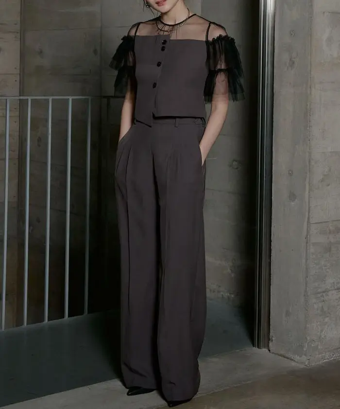 “きちんと感”が欲しい日に頼れる、パンツ派さんのための上品セットアップ。トップスはコンパクトでバランスよく、パンツはワイドストレートで脚のラインを拾いにくいのにスタイルアップが狙えます。肩のチュールフリルが顔まわりを華やかにしつつ、二の腕もさりげなくカバーしてくれるのが嬉しいポイント。とろみのある落ち感素材で動くたびにしなやかに揺れ、写真でもきれいに映えます。ポケット付きで実用性も◎。結婚式・二次会はもちろん、きちんと見せたい会食やお食事会にもおすすめです。