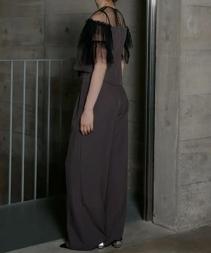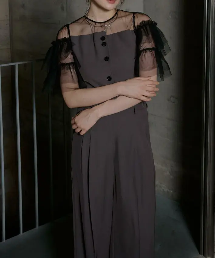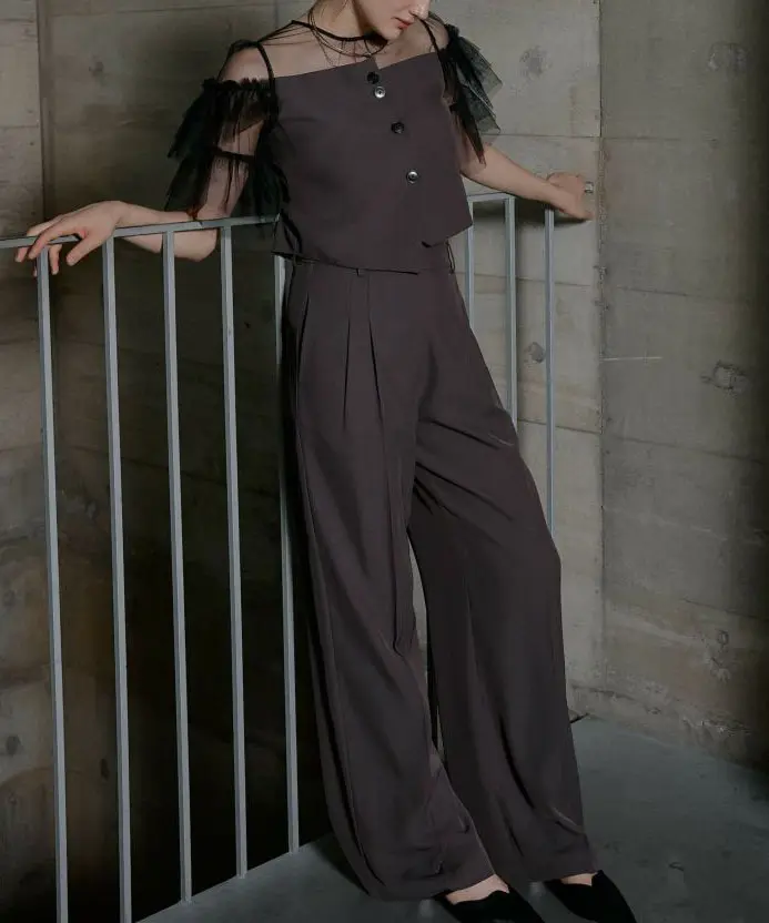 上品さと抜け感を両立させた、イレギュラーデザインのパンツドレス(セットアップ)です。とろみのある落ち感素材が体のラインをきれいに見せ、動くたびにしなやかに揺れるシルエットが印象的。肩のチュールフリルで大人の華やかさをプラスし、程よい肌見せで軽さも演出します。トップスはバックファスナー仕様でデザインボタン付き。パンツはサイドポケット付き(バックポケットはデザイン仕様)、背面ゴム入りで着心地にも配慮されています。お手入れはクリーニング店へご相談ください。