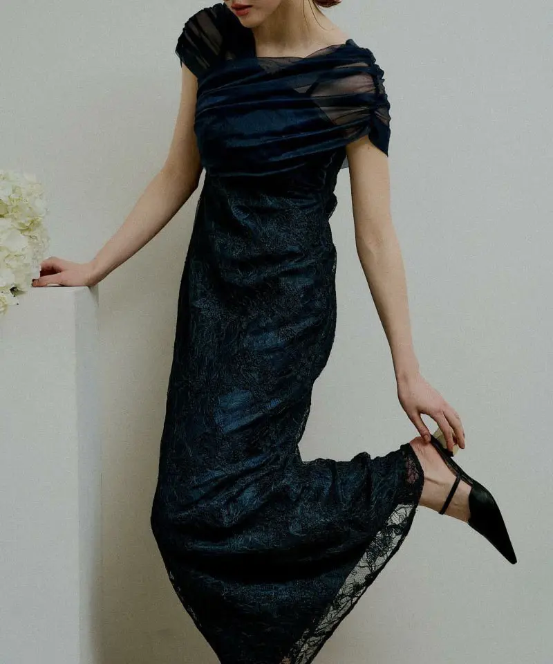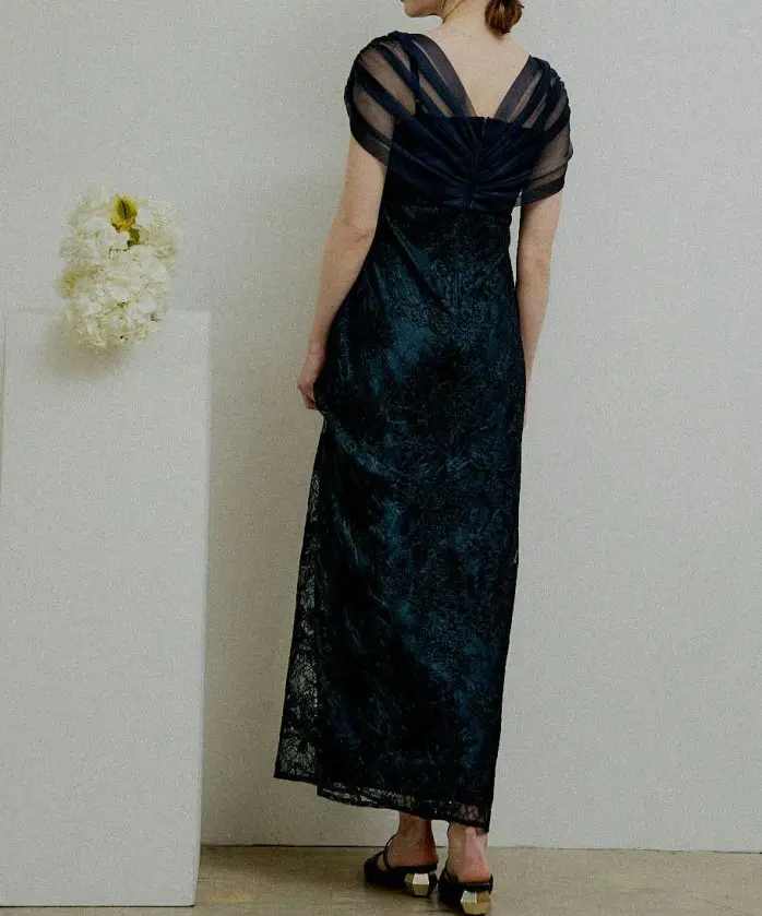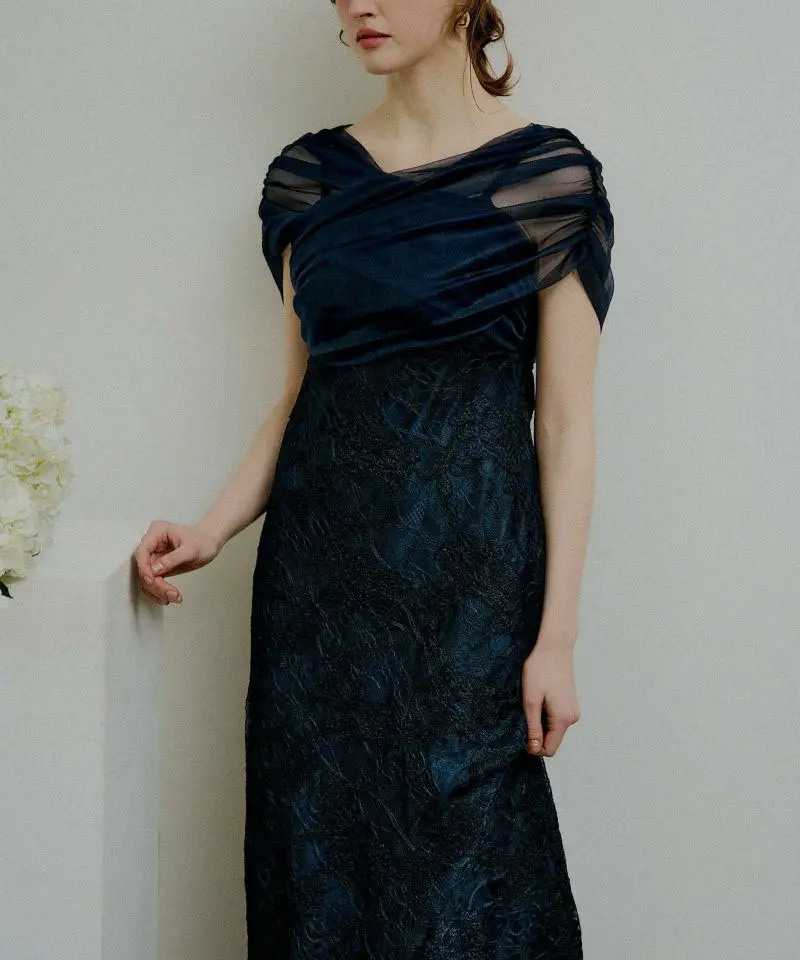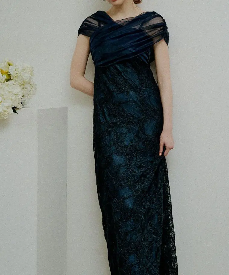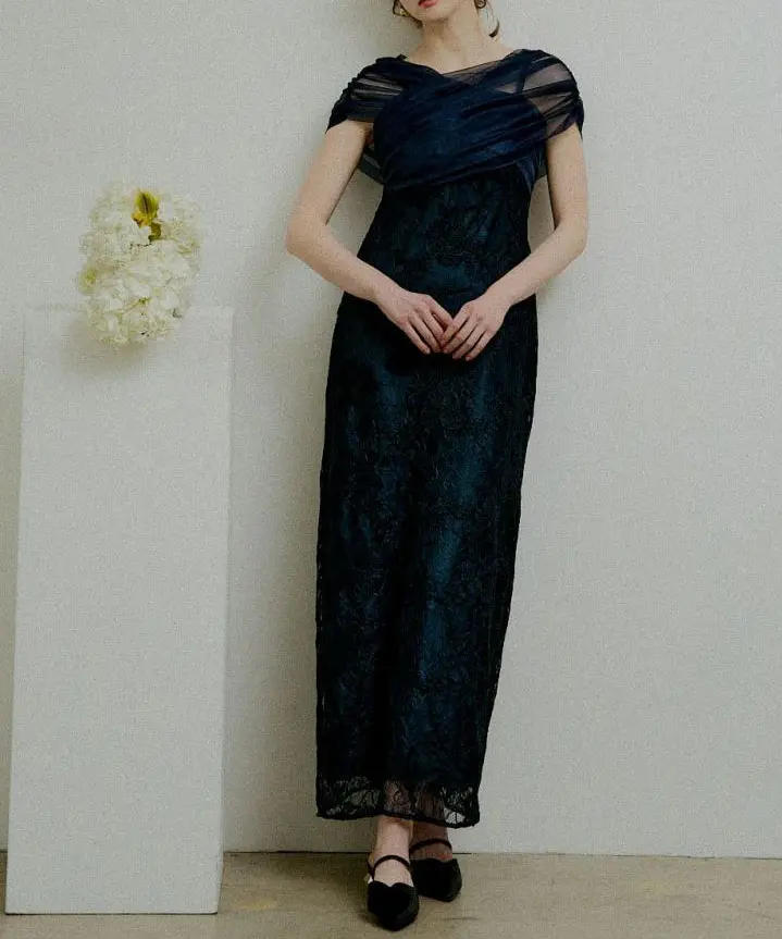 ストール風のラメチュールを重ねた、華やかなレースドレス。胸元には上品なクロスデザインを落とし込み、立体感を出しながら上半身をすっきりと見せてくれます。素材は甘さがありつつも、落ち感のあるシルエットで大人っぽくまとまり、体のラインを拾いすぎない安心感のある仕上がりに。バックファスナー仕様で着脱しやすく、バックスリット入り。裏地ありで透け感も気になりにくいのがポイントです。