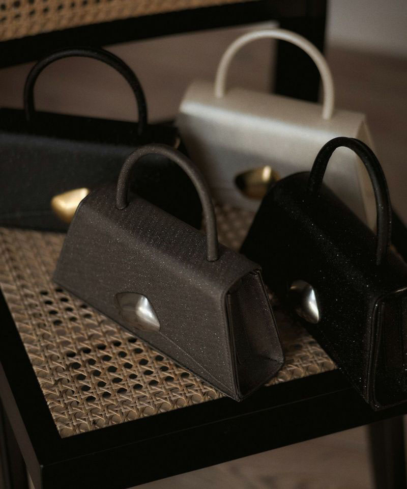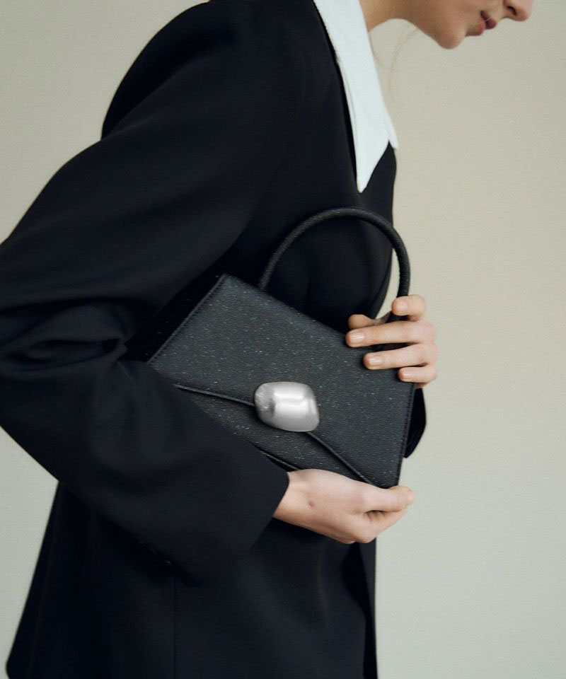 上品な光沢感のあるトランペジウム(台形)フォルムのバッグ。ゴールドモチーフのブラック/ベージュに加え、シルバーモチーフのブラックも展開されています。小ぶりなサイズながらマチ付きでしっかりとした作りで、華やかなパーティーシーンからデイリーのきれいめスタイルまで幅広く合わせやすいデザインです。チェーン付きで、取り外しも可能です。