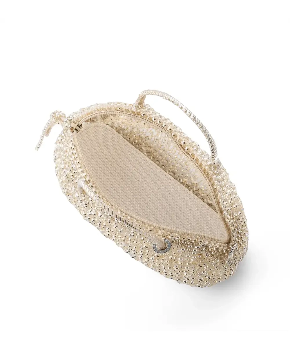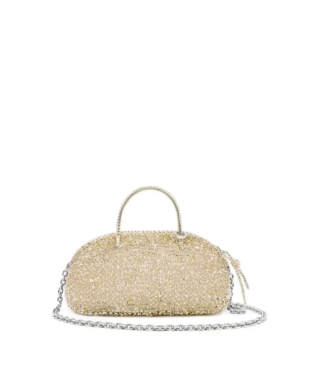 シルバー×シャンパンゴールドが表裏になった“シルバーゴールド”は、肌なじみの良さと華やかさを両立できる万能カラー。ころんとしたオーバルシルエットで可愛さがありつつ、ファスナー引き手のワイヤーコードがさりげなく効いて大人っぽく持てます。スモールサイズでもスマホやフラグメントケース、小さめポーチまで収まりやすく、パーティーからきれいめ普段使いまで出番が多いアイテムです。斜めがけチェーンは取り外しできるので、手持ちで上品に・ショルダーで実用的にとシーンで使い分けできます。