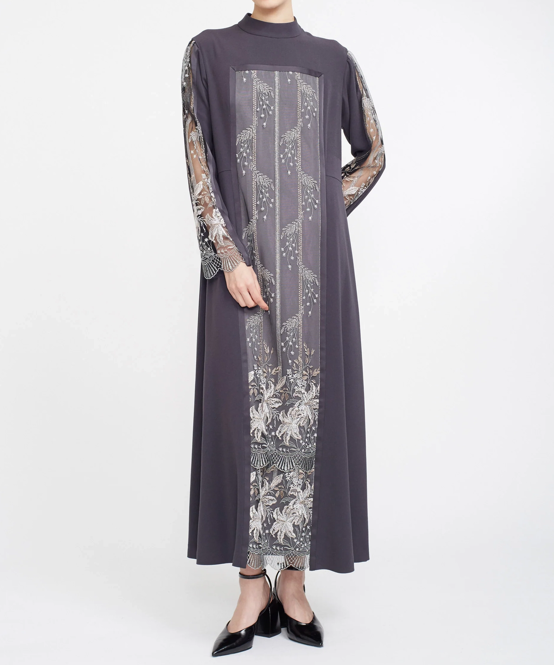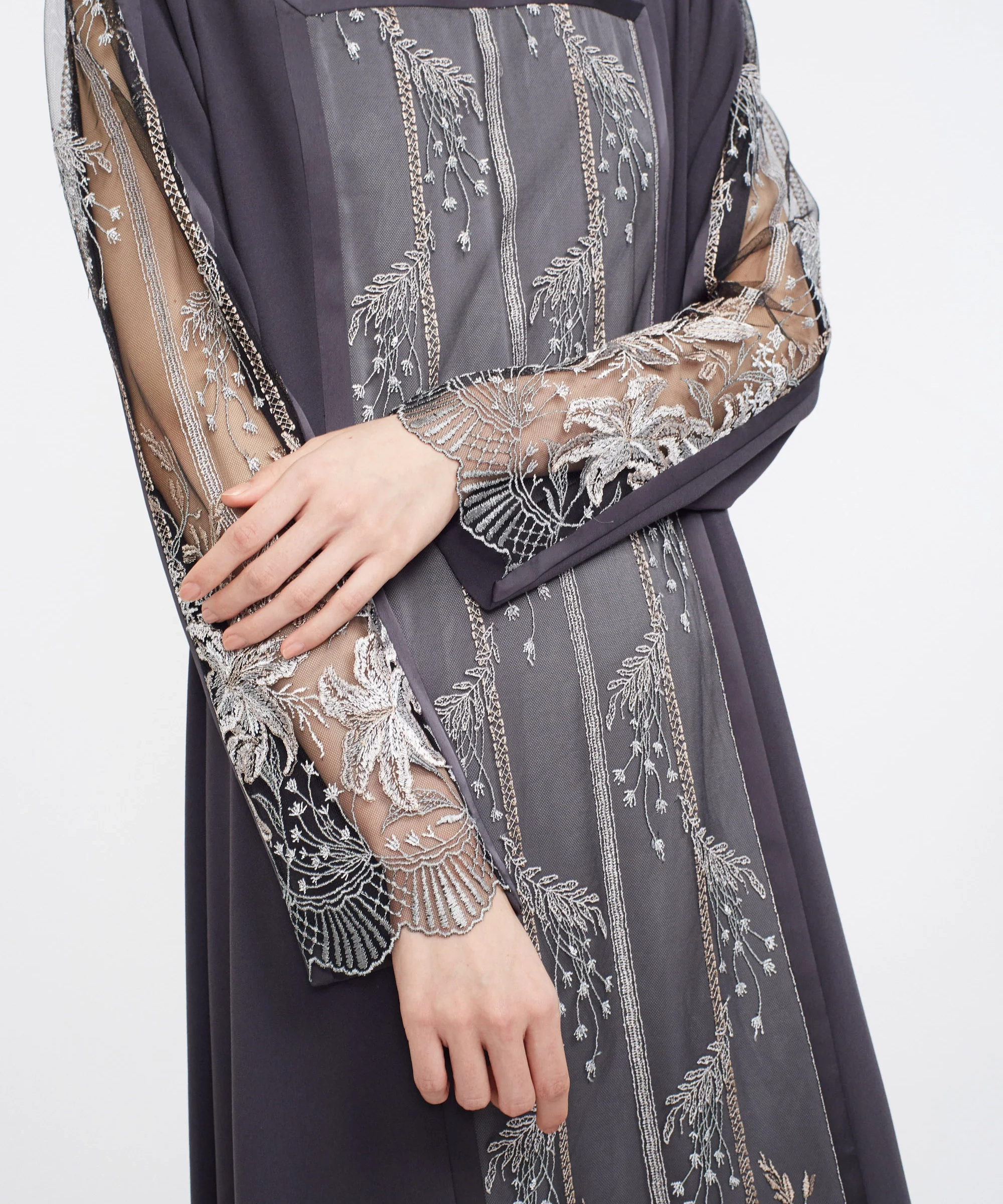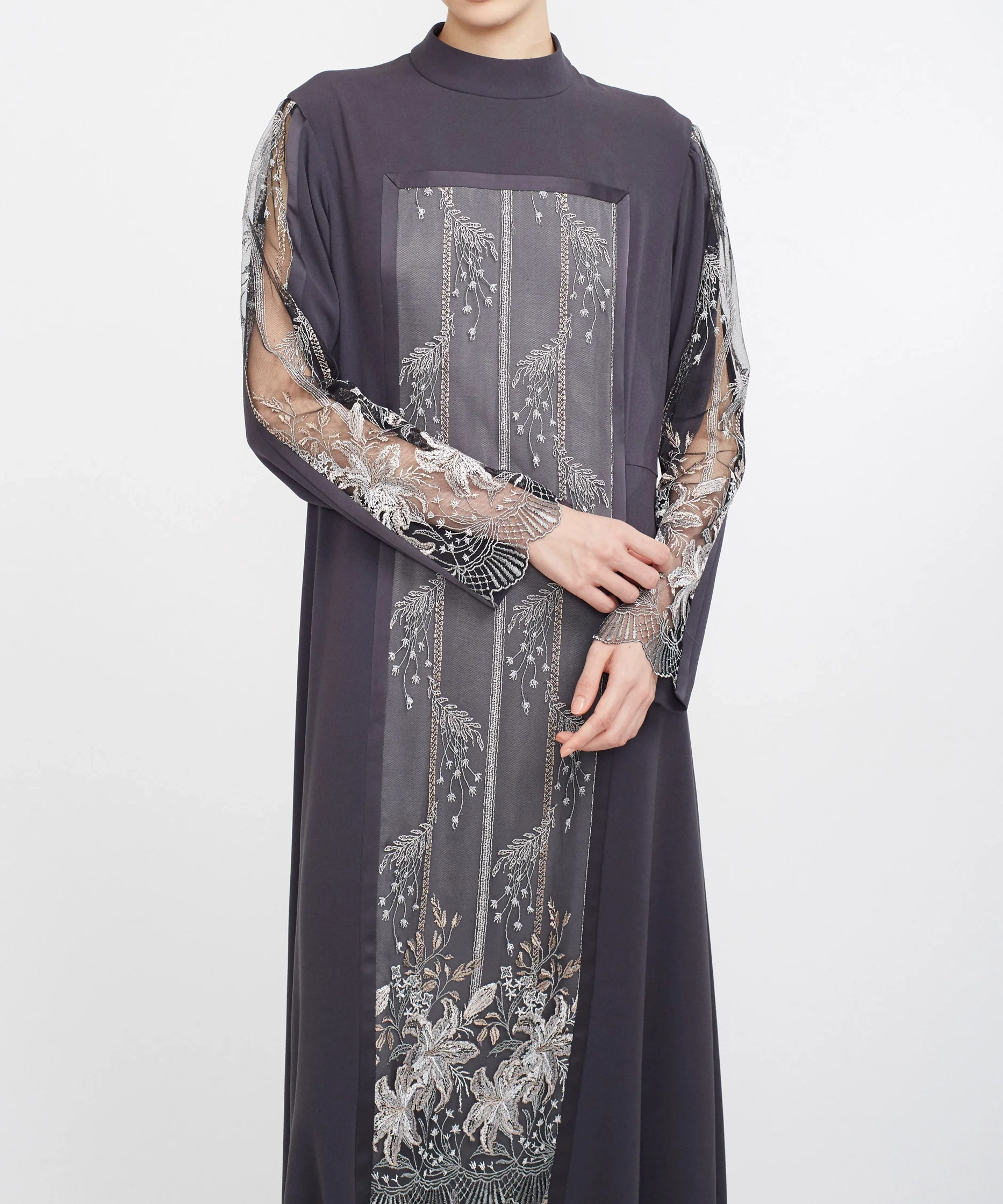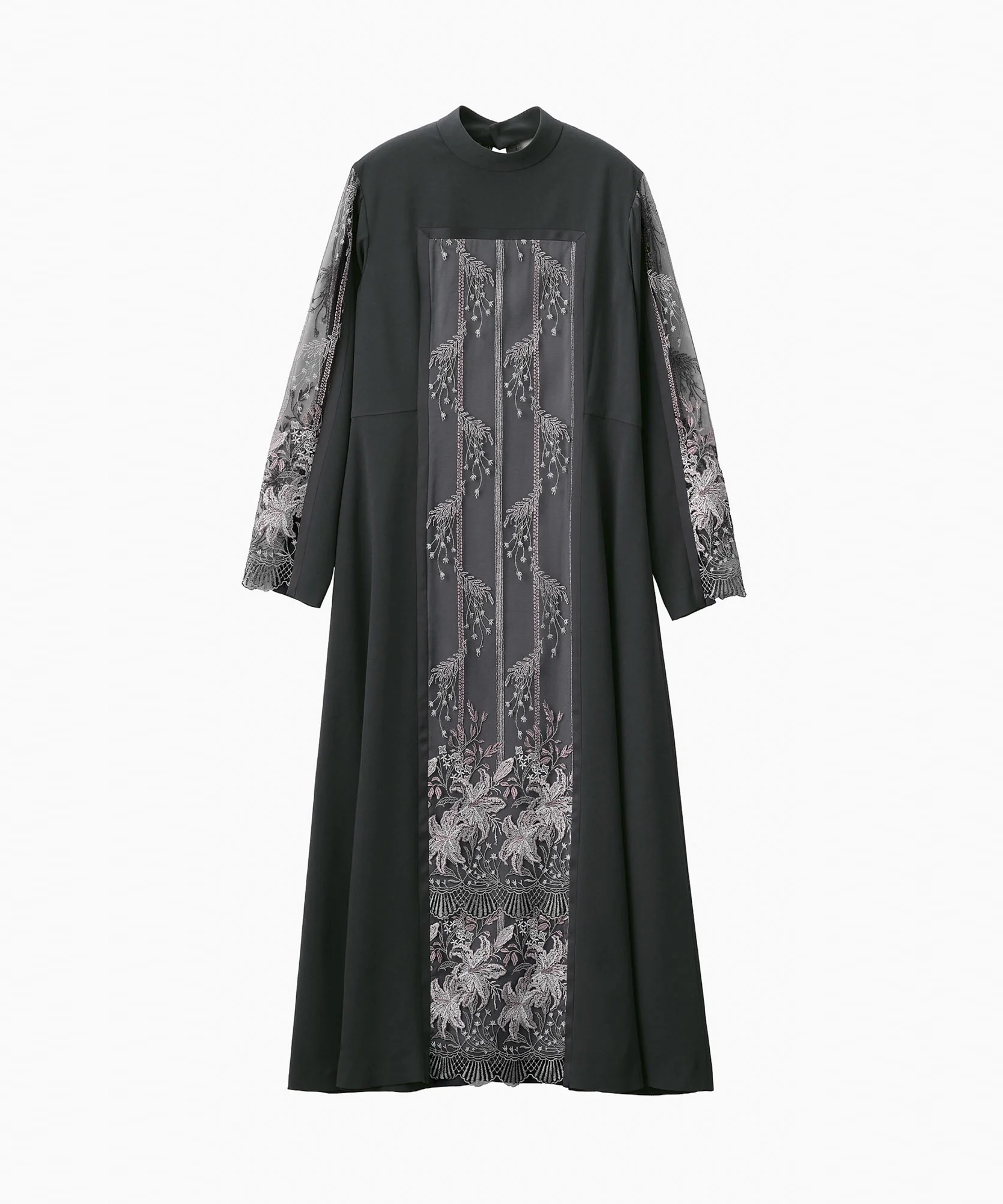 MURRALらしい繊細な刺繍が主役のドレスで、1枚でコーディネートが完成する存在感のあるアイテムです。落ち着いたカラーと上品なデザインで、結婚式やパーティーはもちろん、ホテルディナーなどにもおすすめ。縦のラインを強調するシルエットで、すっきりとした印象に見せてくれます。