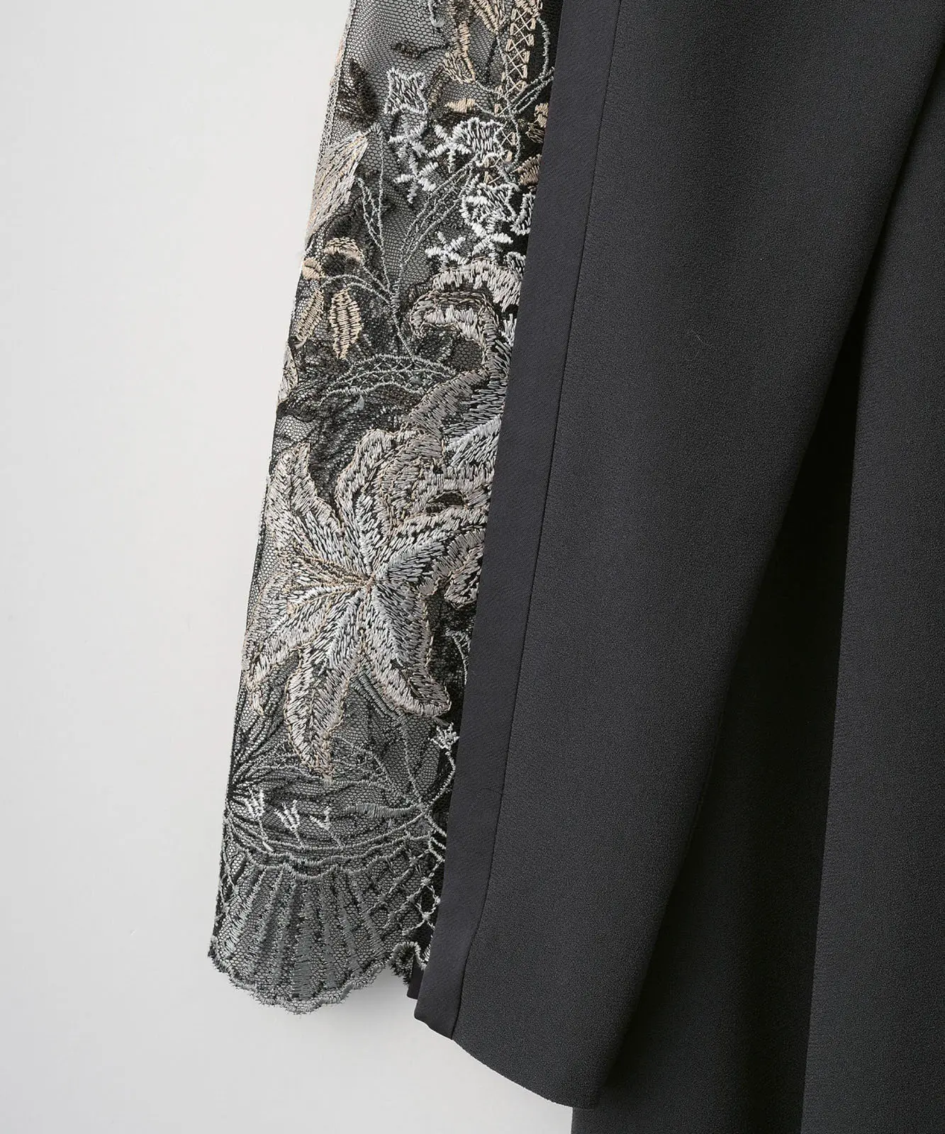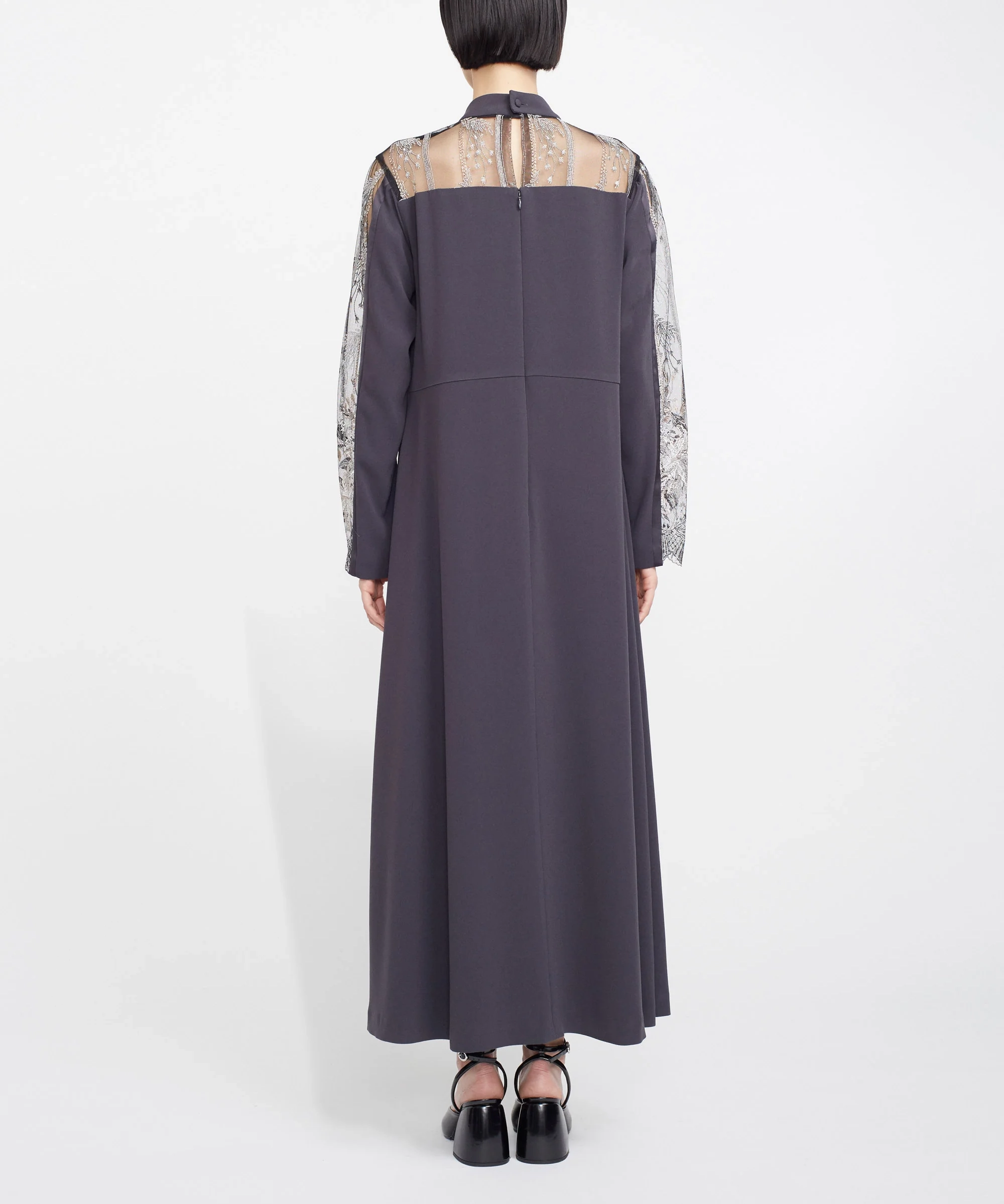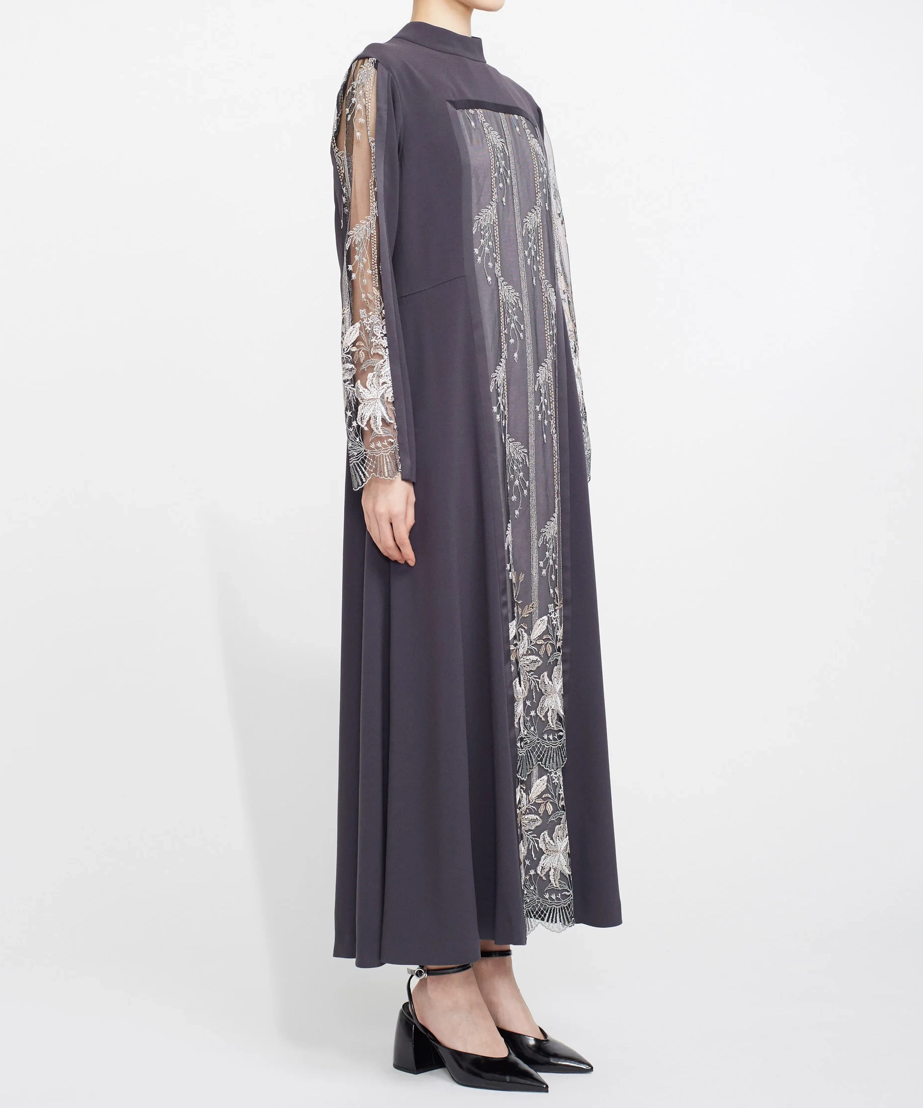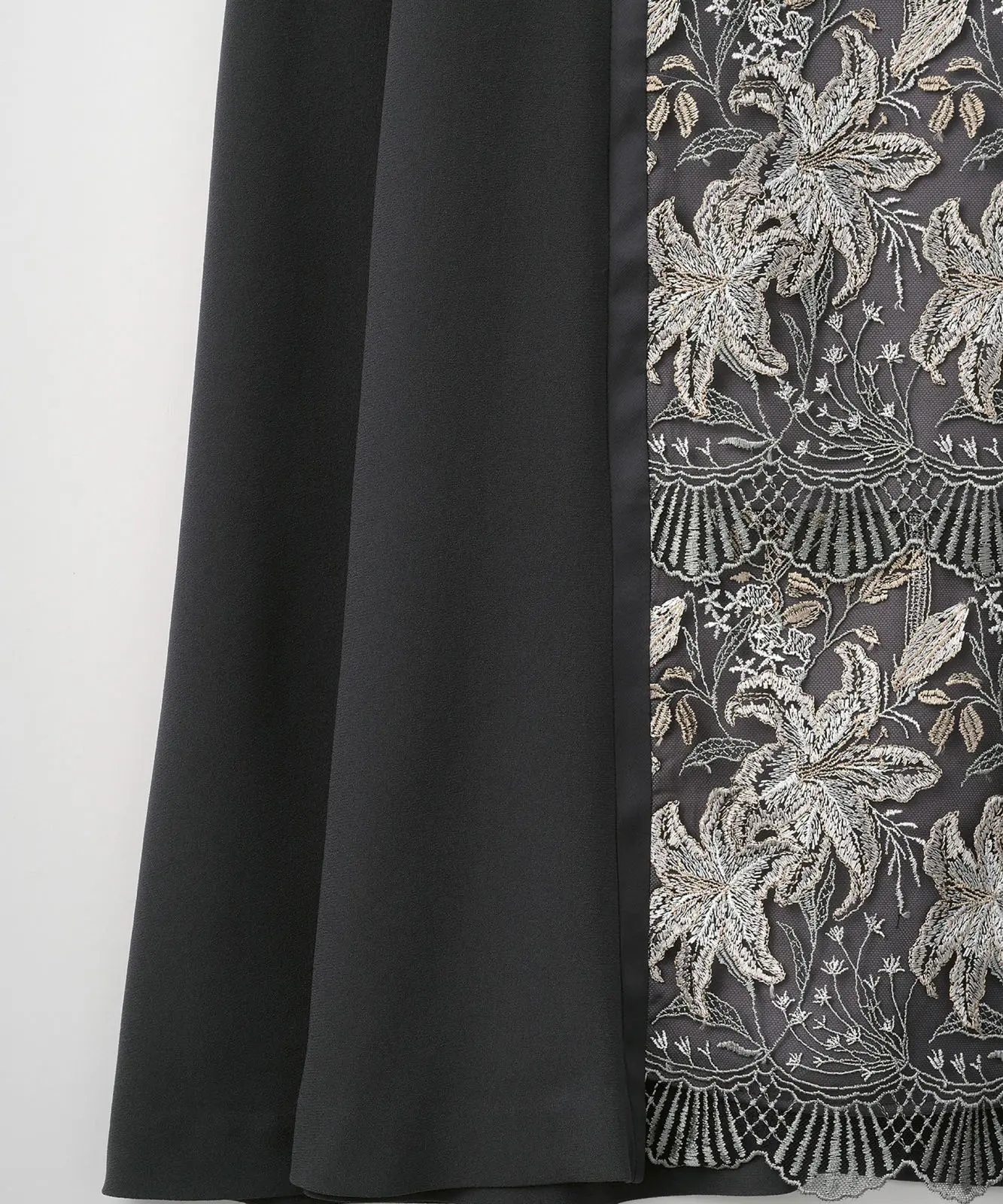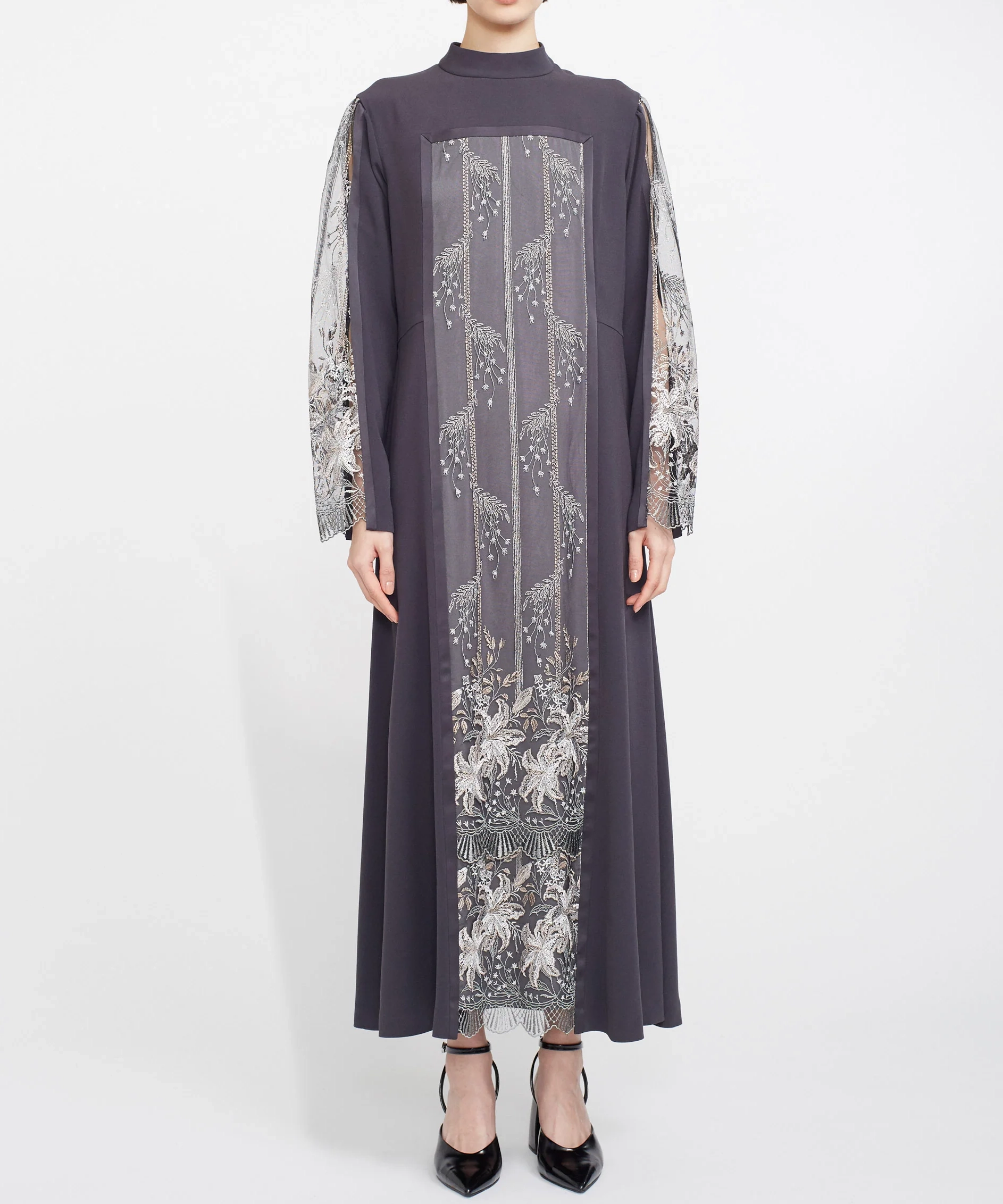 MURRALらしい繊細な刺繍が主役のドレスで、1枚でコーディネートが完成する存在感のあるアイテムです。落ち着いたカラーと上品なデザインで、結婚式やパーティーはもちろん、ホテルディナーなどにもおすすめ。縦のラインを強調するシルエットで、すっきりとした印象に見せてくれます。