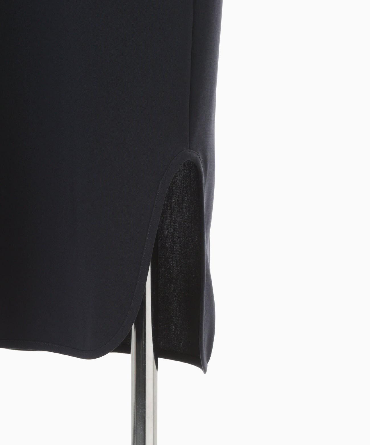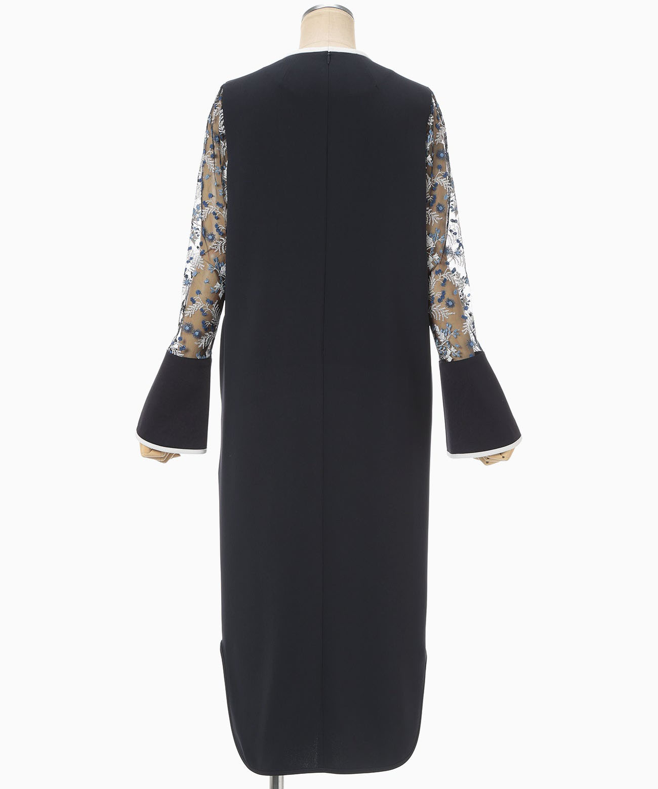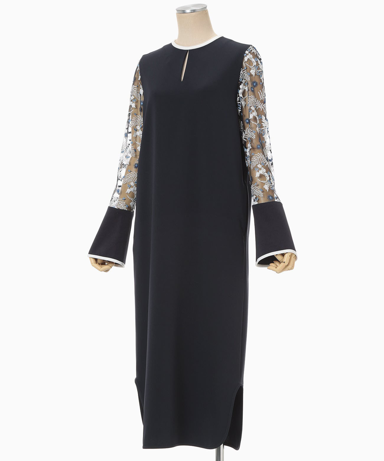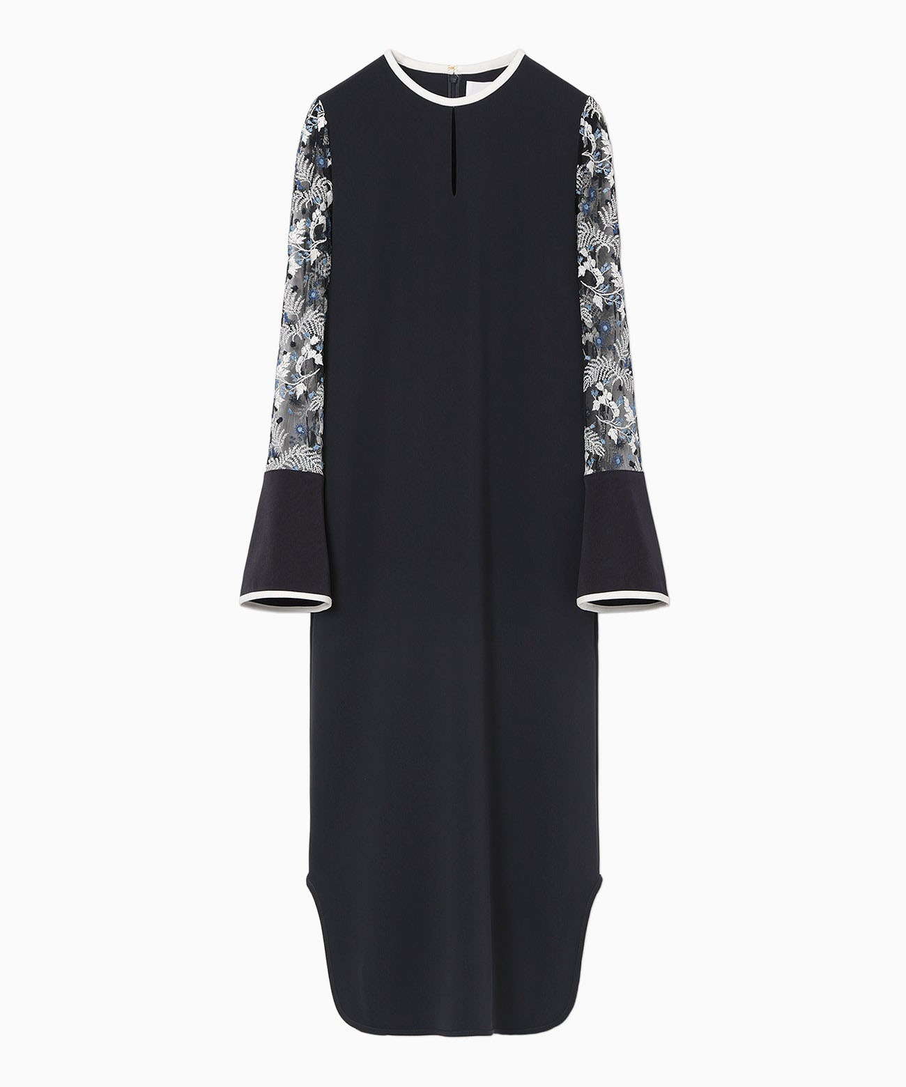 リバーレースの繊細な表情と、ブランド特有の構築的なパターンが融合したドレス。身体のラインを美しく見せる立体的なシルエットに加え、デコルテや袖部分のレースが軽やかな抜け感を演出します。トリアセテート混の上品な質感が全体に高級感を与え、シンプルながらも存在感のある仕上がりに。ネイビーカラーでシーンを問わず着用でき、長く愛用いただける一着です。